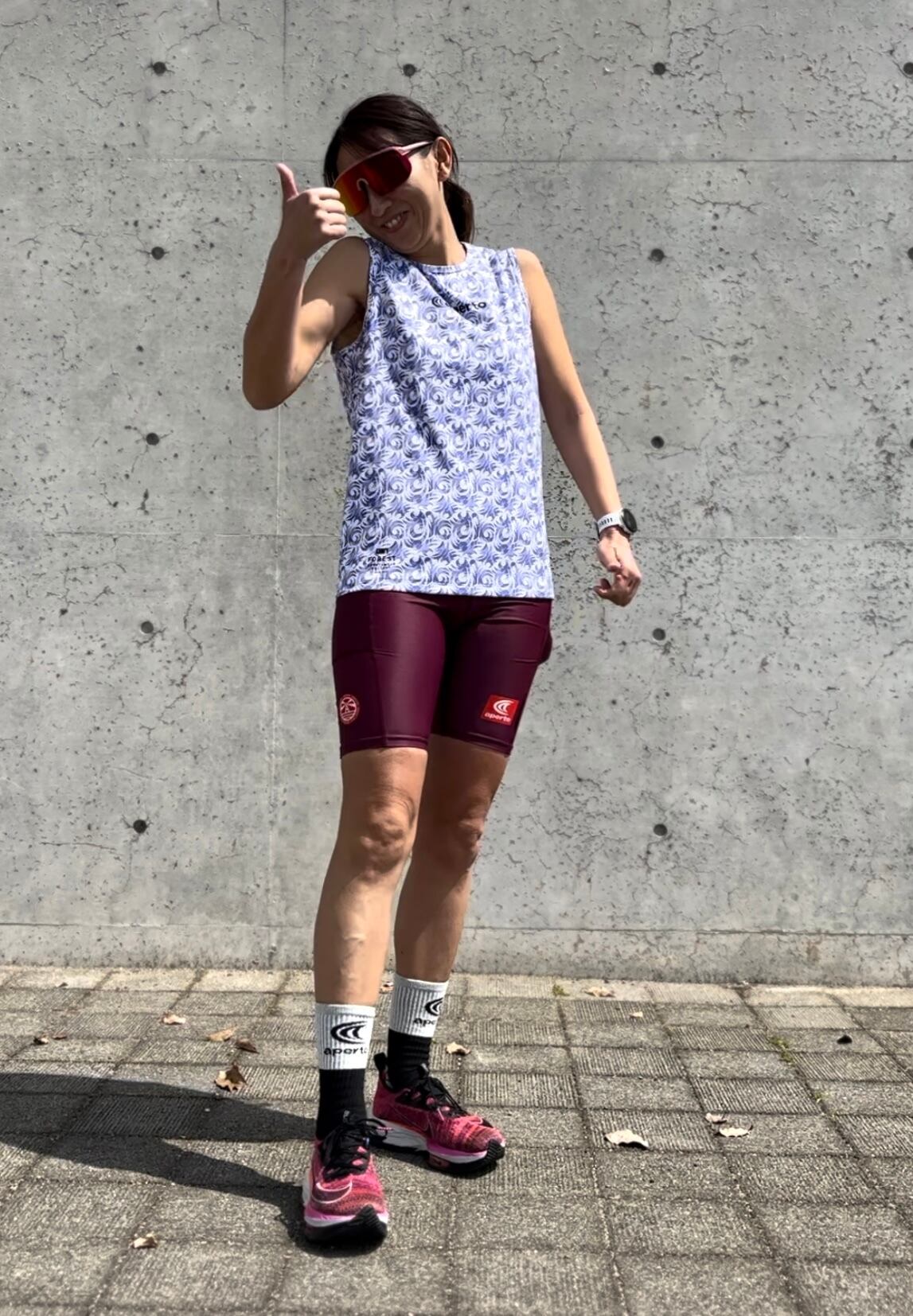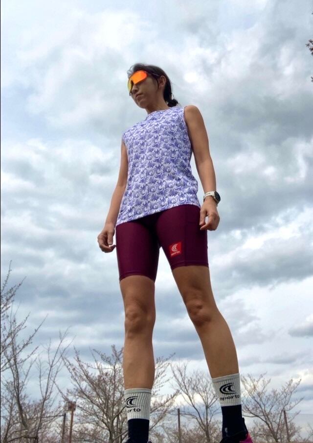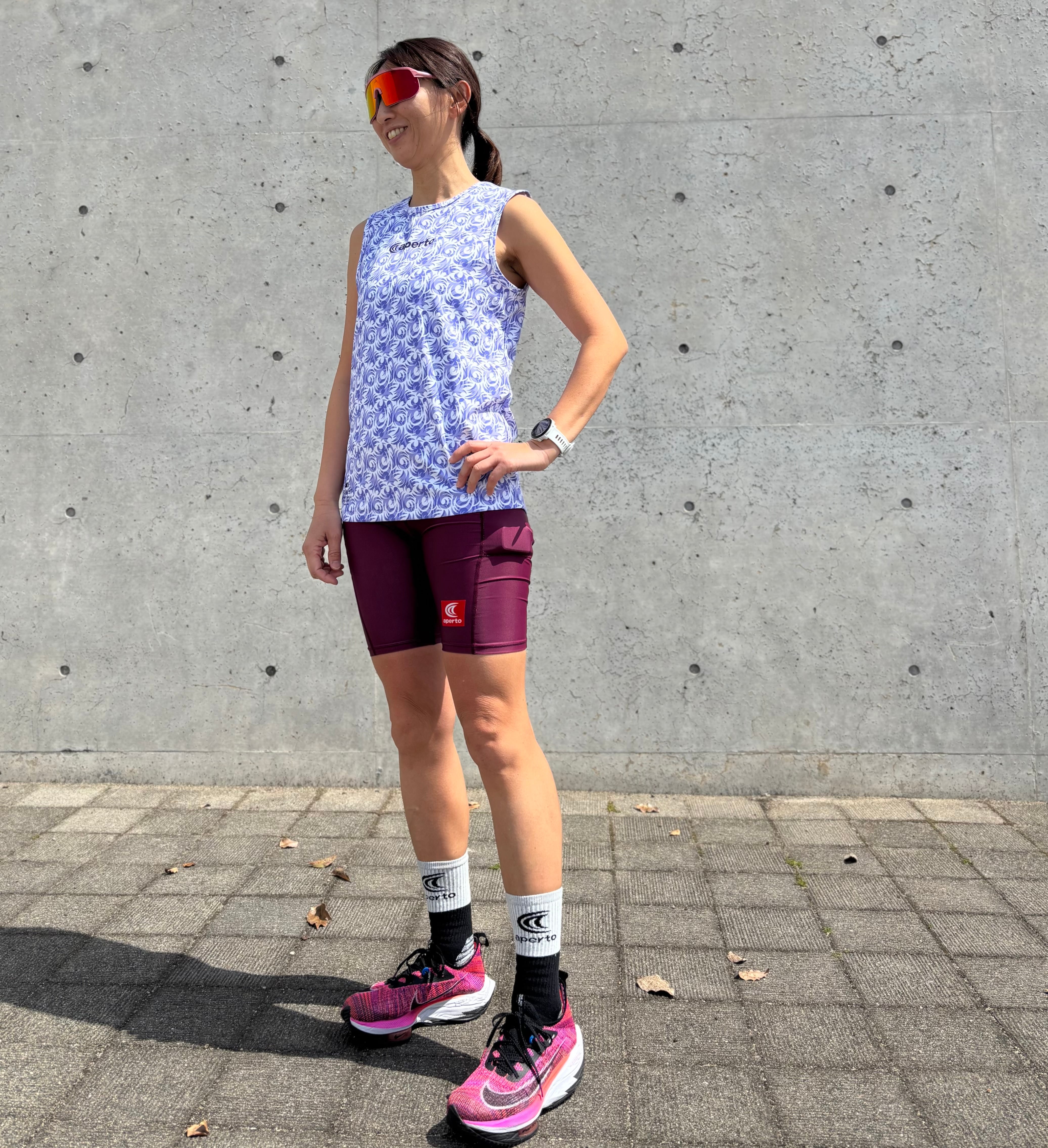 アペルト自社開発のパターンで、日本人女性ランナー様にむけたサイズ設計をしているスタイリッシュなノースリーブです。程よくフィットするサイズ感でアドバンスタイツとの相性もよいスタイリッシュなデザインです。