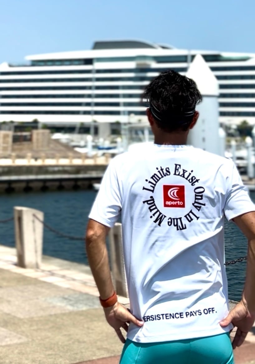 「Limits Exist Only In The Mind.」限界は心の中のみにある!アペルトからの応援メッセージをバックロゴに込めたTシャツになります。