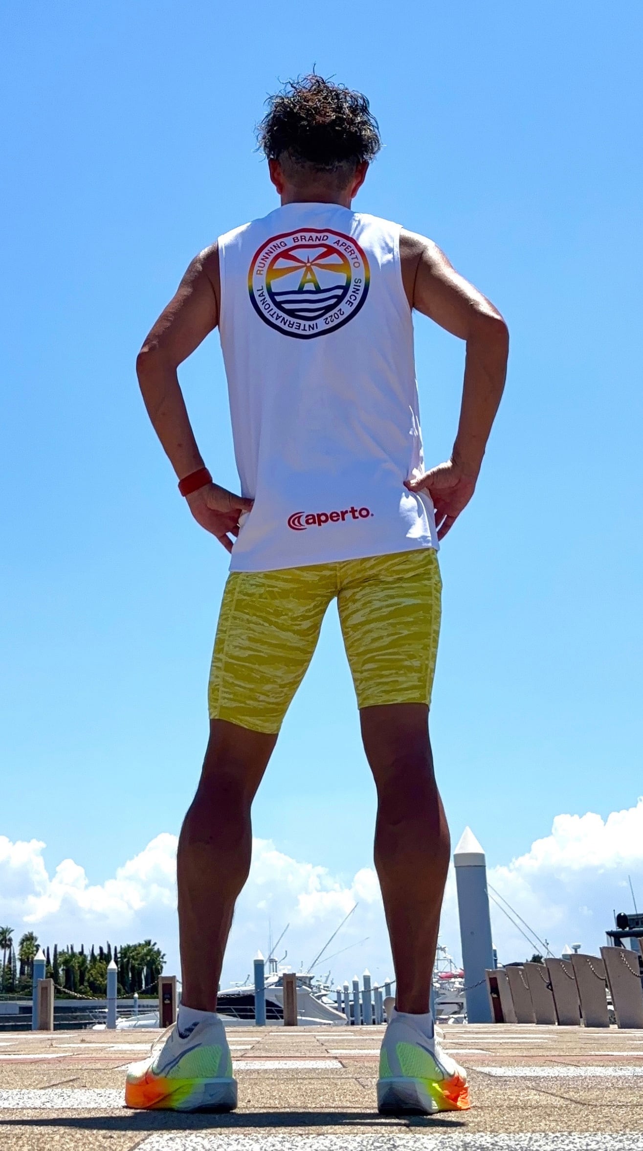 前身にレインボーカラーでAPERTOのロゴ文字、後身に大きく灯台ロゴをアレンジしてカジュアルな雰囲気でありながらスタイリッシュなノースリーブに仕上げています。爽やかな夏らしい印象でアドバンスタイツとも合わせやすいデザインです。ランニングはもちろん、ジムやフィットネスといったトレーニングにもご愛用頂けるシンプルなノースリーブです。汗をかいても透けないとご好評頂いている艶感のあるホワイトカラーです。シンプルで着まわしのきくアぺルトおすすめのノースリーブです。