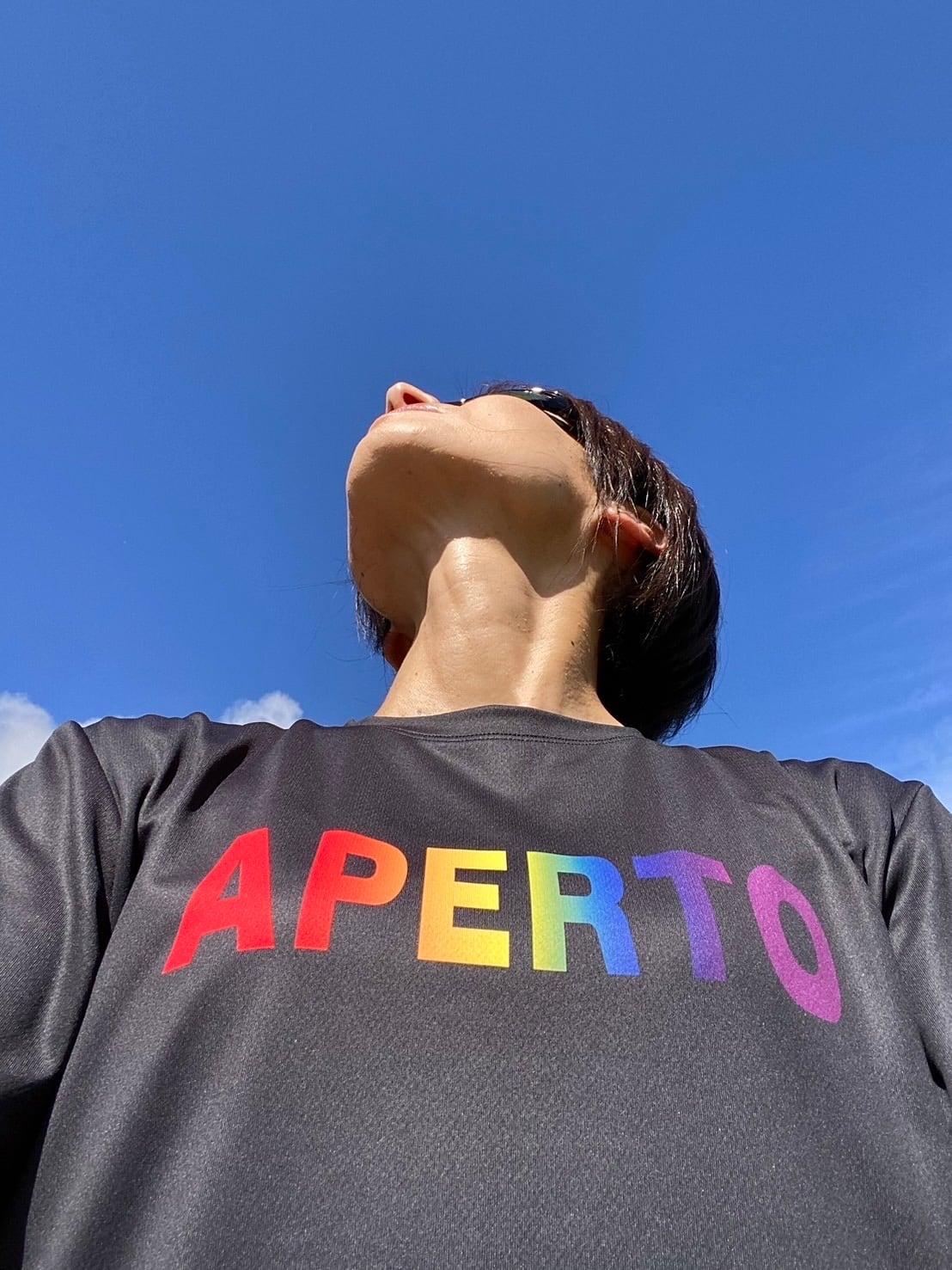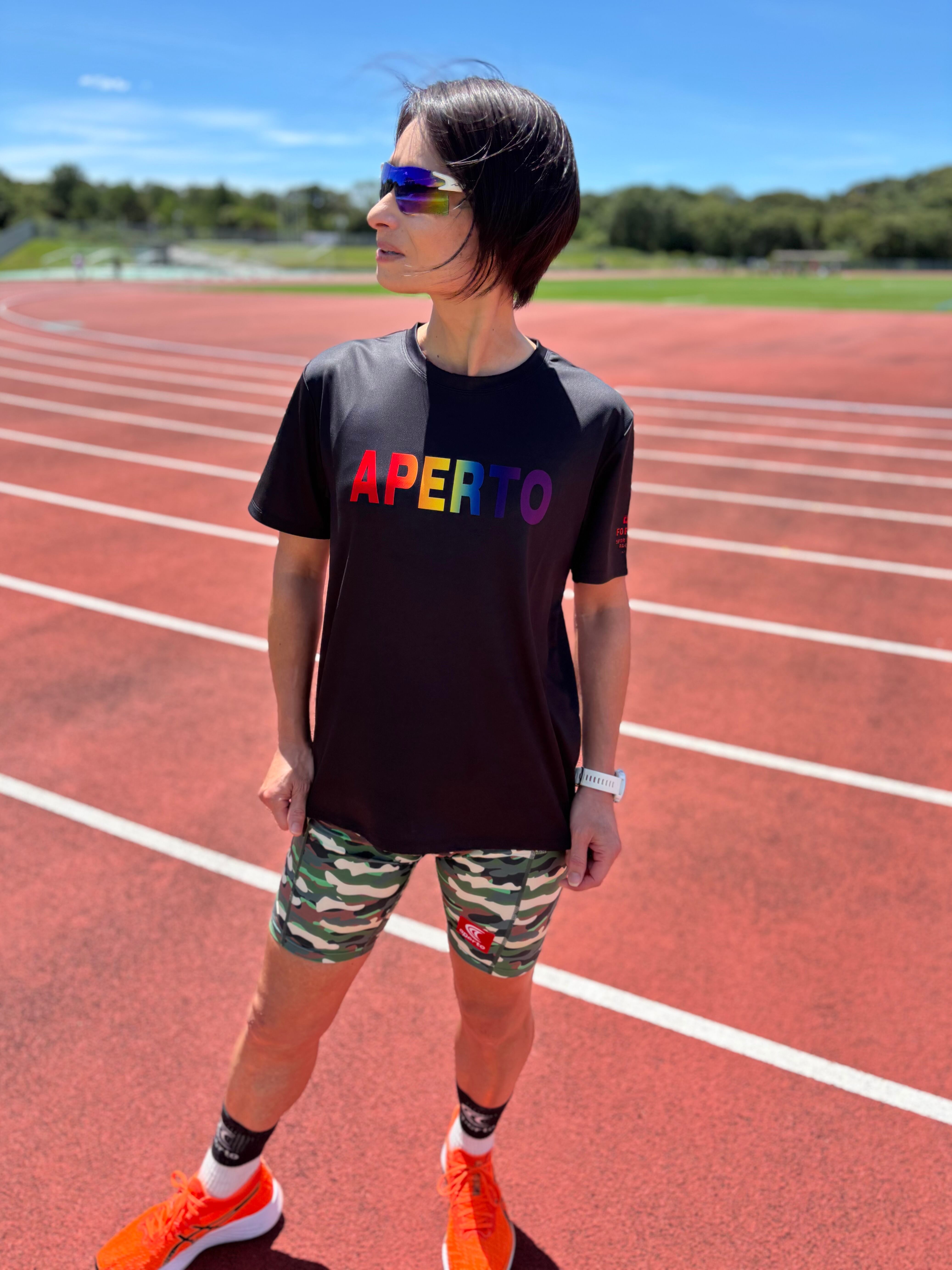 レインボーカラーで前面にAPERTOのロゴ、後面に灯台ロゴをアレンジしたカジュアルTシャツになります。ランニングはもちろん、様々なアクティビテイシーンや、アフターランニングのお食事や普段使いでもご愛用頂けるカジュアルTシャツです。ご好評頂いている、艶感のあるブラックカラーは、男女問わずご愛用頂けるアペルトお勧めのTシャツです。