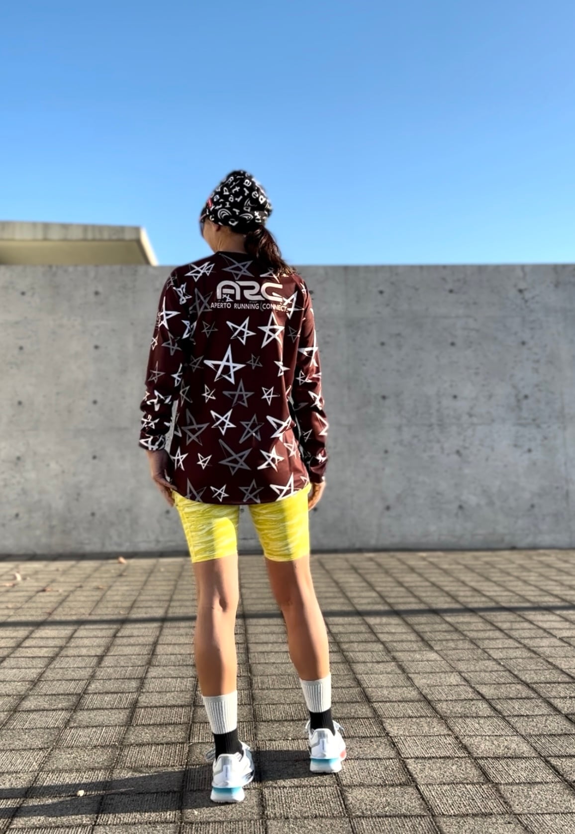 25年秋冬NEWカラーで登場するランダムスター長袖Tシャツです。バックにはARC(アペルトランニングコネクト)のロゴを全昇華して格好よくアレンジした、ラグラン袖の長袖でスタイリッシュなデザインです。裾は若干後ろを長く、前後差をつけており、緩やかなカーブにしております。着丈も少し長めにしており、アドバンスタイツとの相性もよいスタイリッシュなフォルムです。マロンブラウンをベースに、星柄をランダムにアレンジしたお洒落なデザインは、ランニングはもちろんアフターや普段使いのロンTとしても着回しの効くデザインです。男女問わずご愛用頂けるユニセックスサイズでのお勧めロンT企画になります。