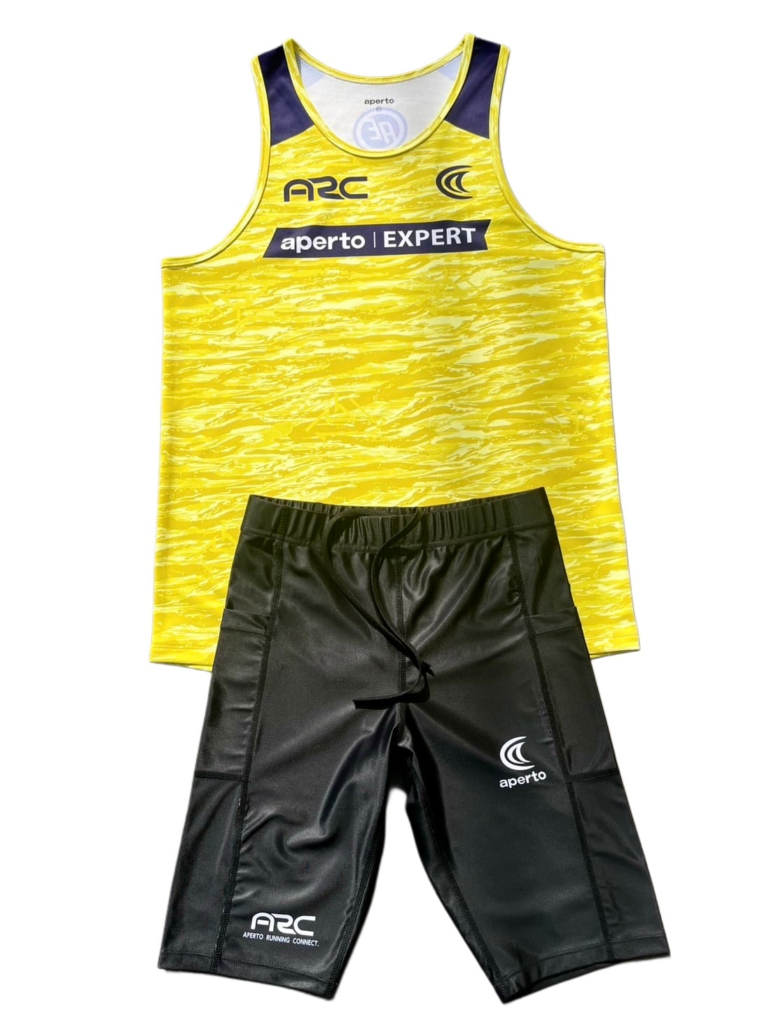 アペルトエキスパート企画のレーシングシングレットです。イエローの霧柄をベースに、ショルダーはネイビーでアクセントをつけた、スタイリッシュなデザインです。日本人の体型にフィットするように自社でパターンを開発して、一貫してメイドインジャパンでプロデュースした本格的なレース用シングレットです。アペルトエキスパートお勧めのシングレットです。