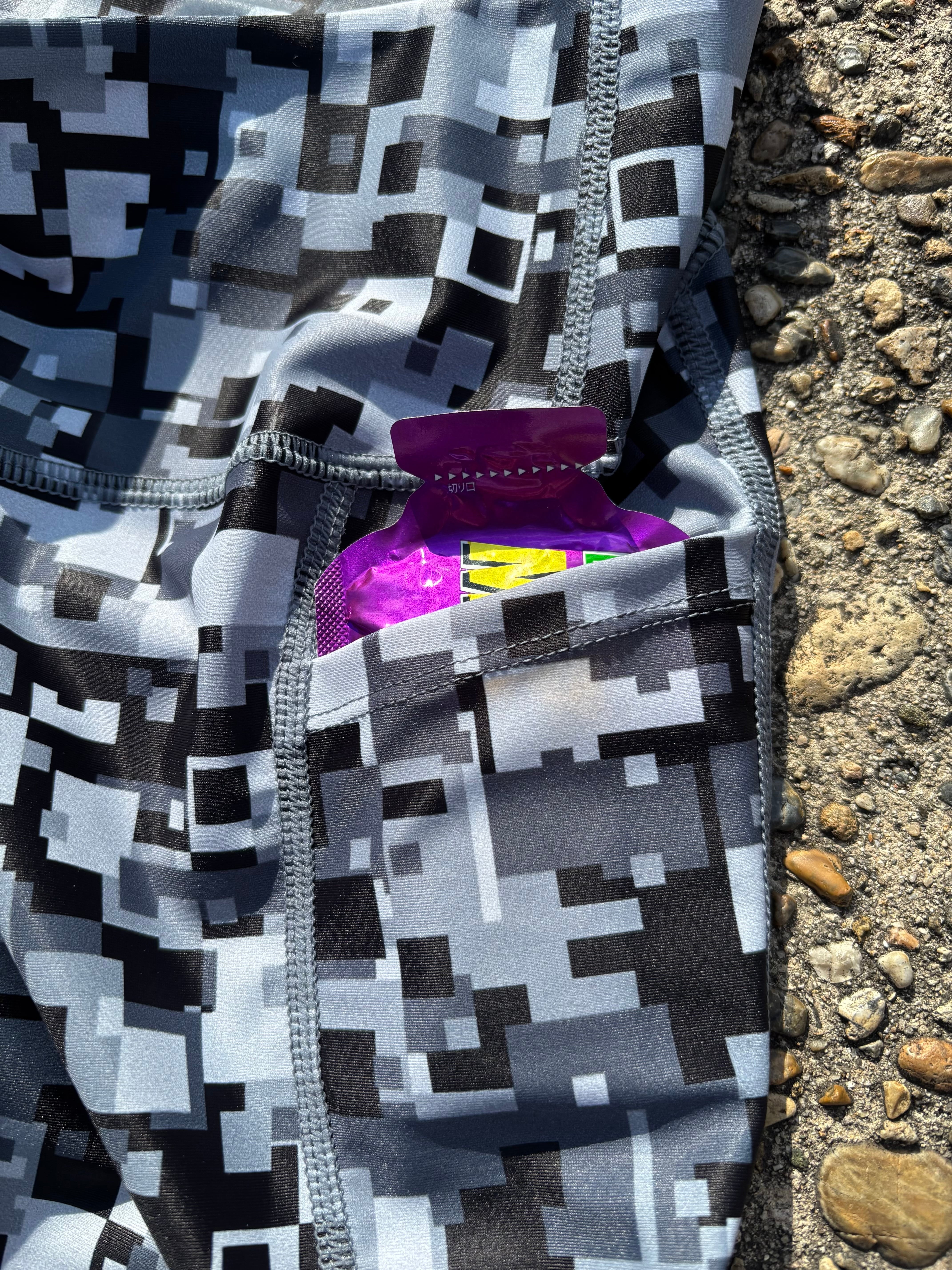 お尻と腰骨の間の両脇にポケットを配置しています。スマホや長めのジェルも収納可能です。フィット感のよい場所に配置しているのでランニング時の揺れやポケット内で小物が動いたりするストレスも感じずにご使用頂けます。