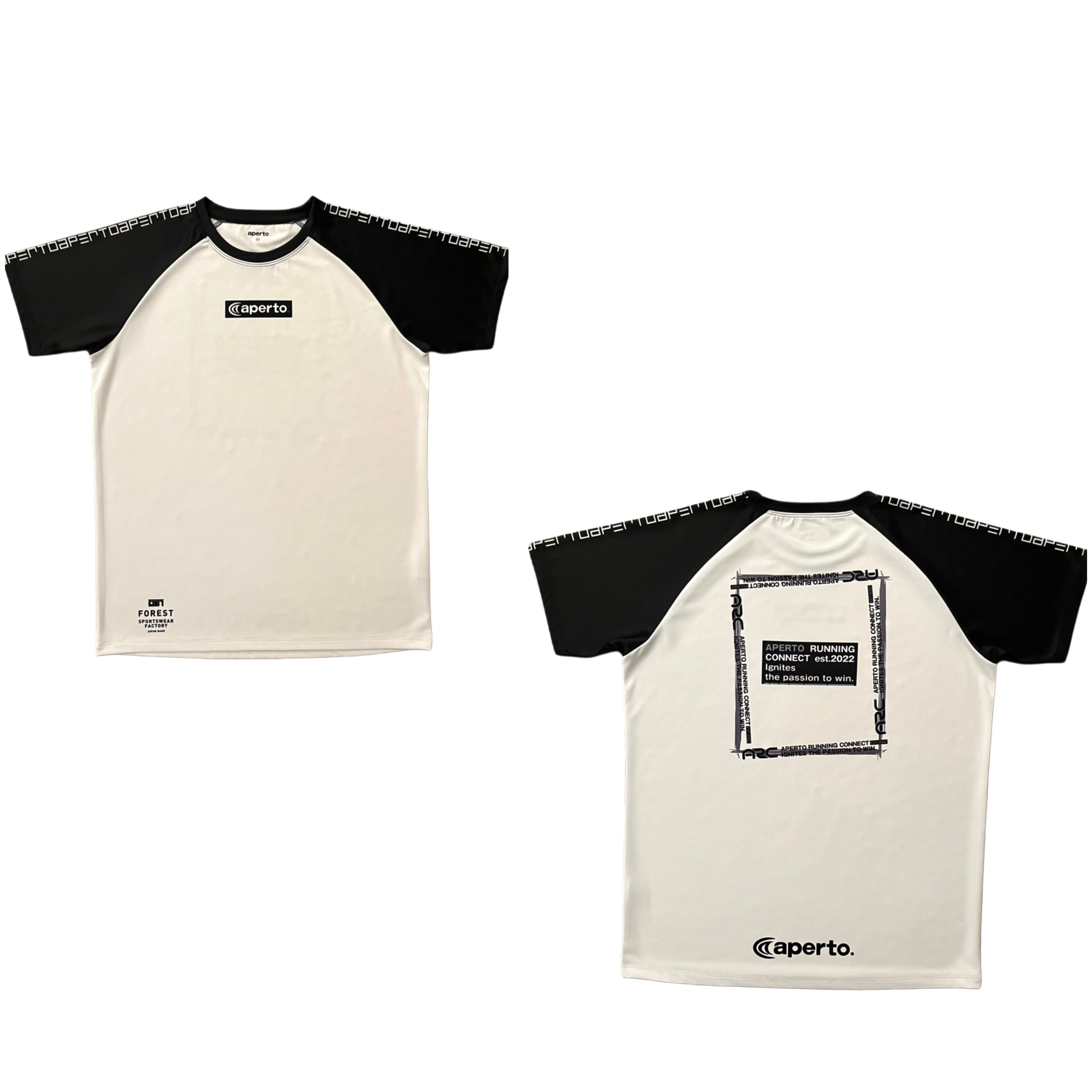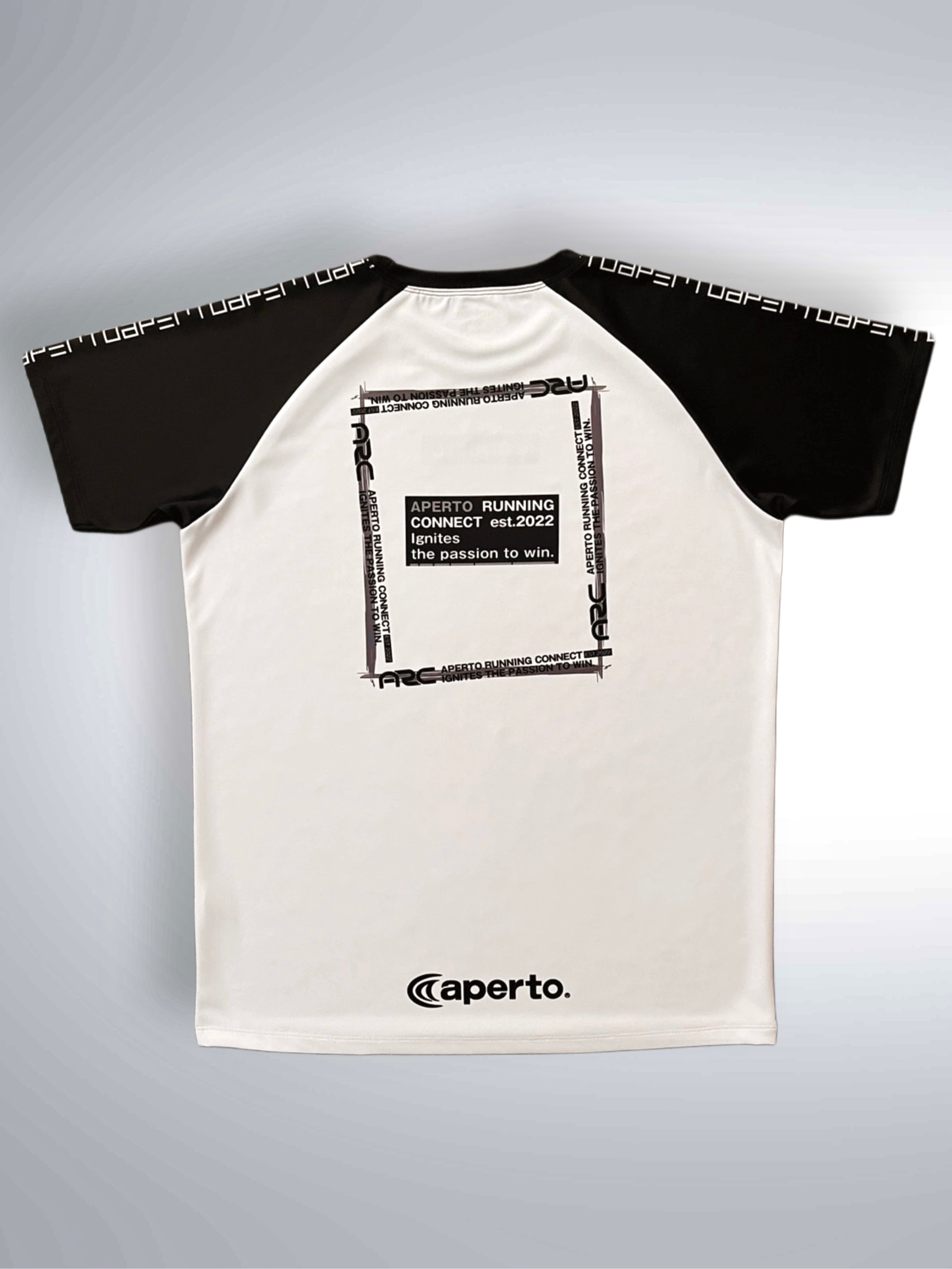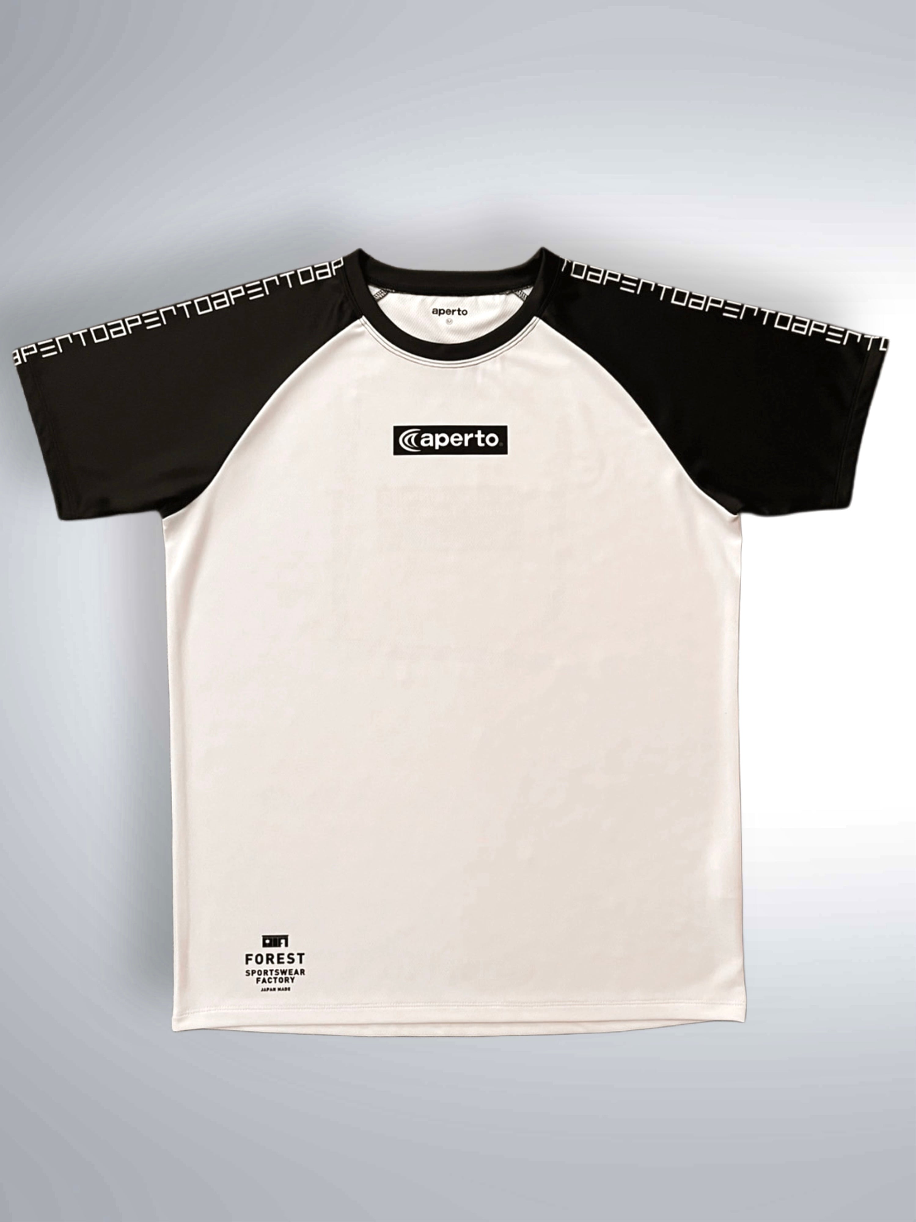 バックにロゴをお洒落にアレンジしたスタイリッシュなラグランTシャツになります。肩にはapertoの文字をデジタルに配置してアレンジしています。アペルトが自社でパターン(型紙)したラグランスリーブは、動きやすく、すっきりとした見え感でありながら、着やすい設計がご支持いただけております。ホワイトに袖をブラックで配色したお洒落なラグランTシャツになっています。