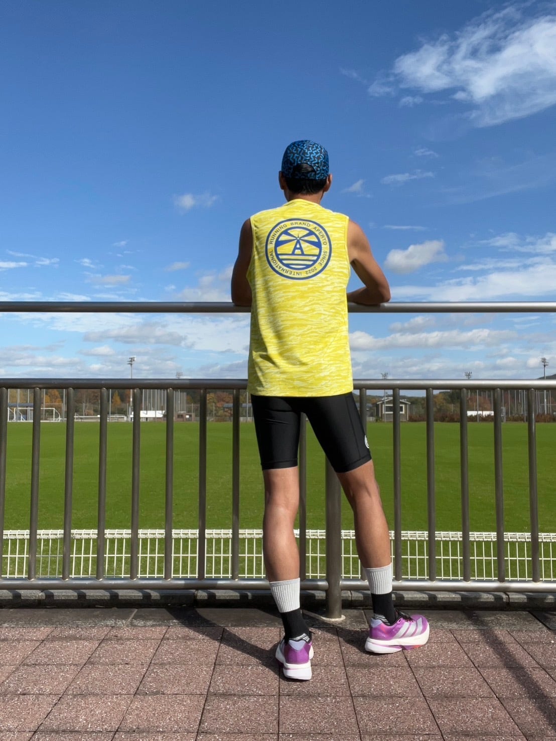 自社全昇華プリントによってカラー開発された鮮やかなイエローです。艶やかで春らしい華やかさのあるイエローノースリーブは、タイツとのスタイリングによりお洒落なランニングスタイルを演出します。