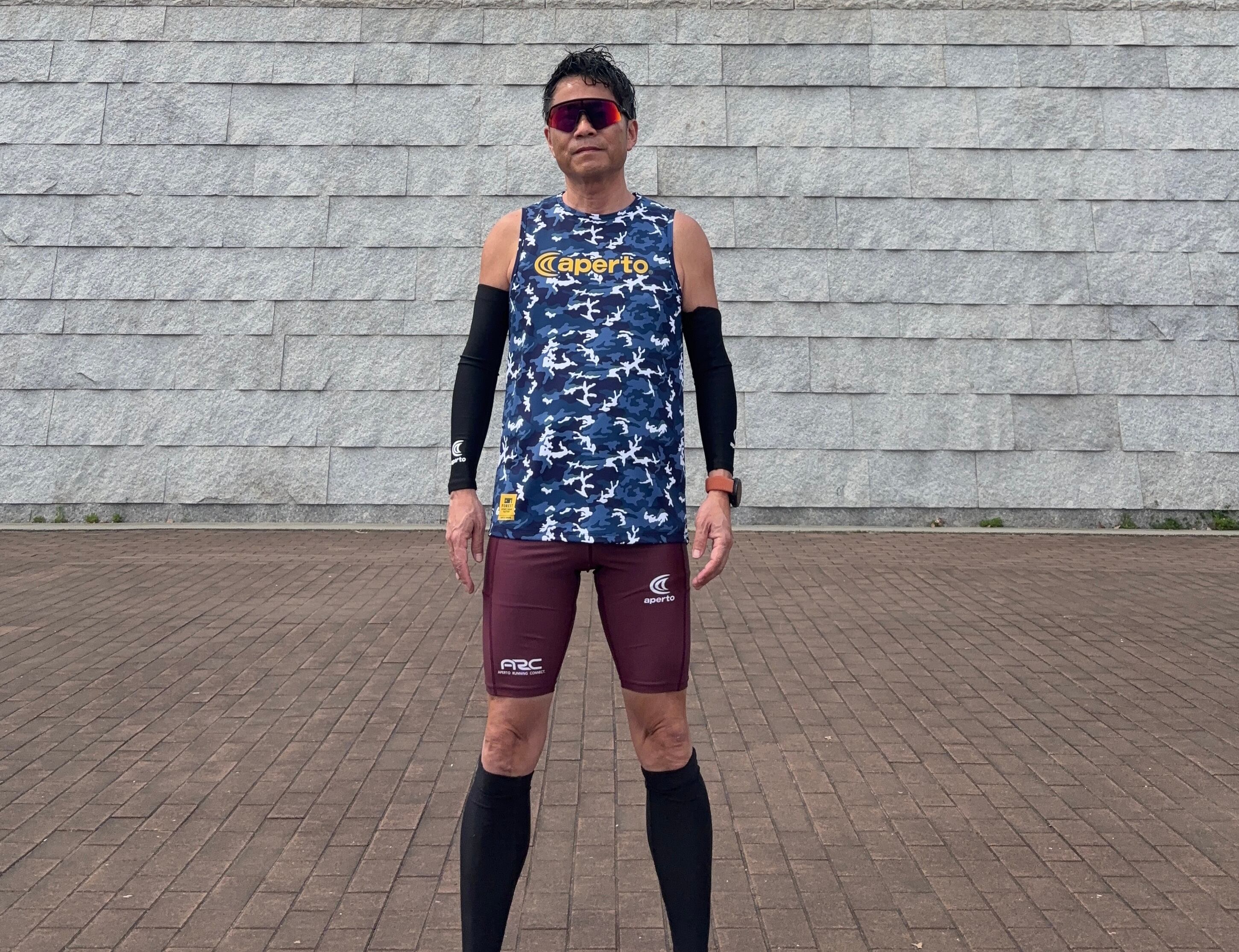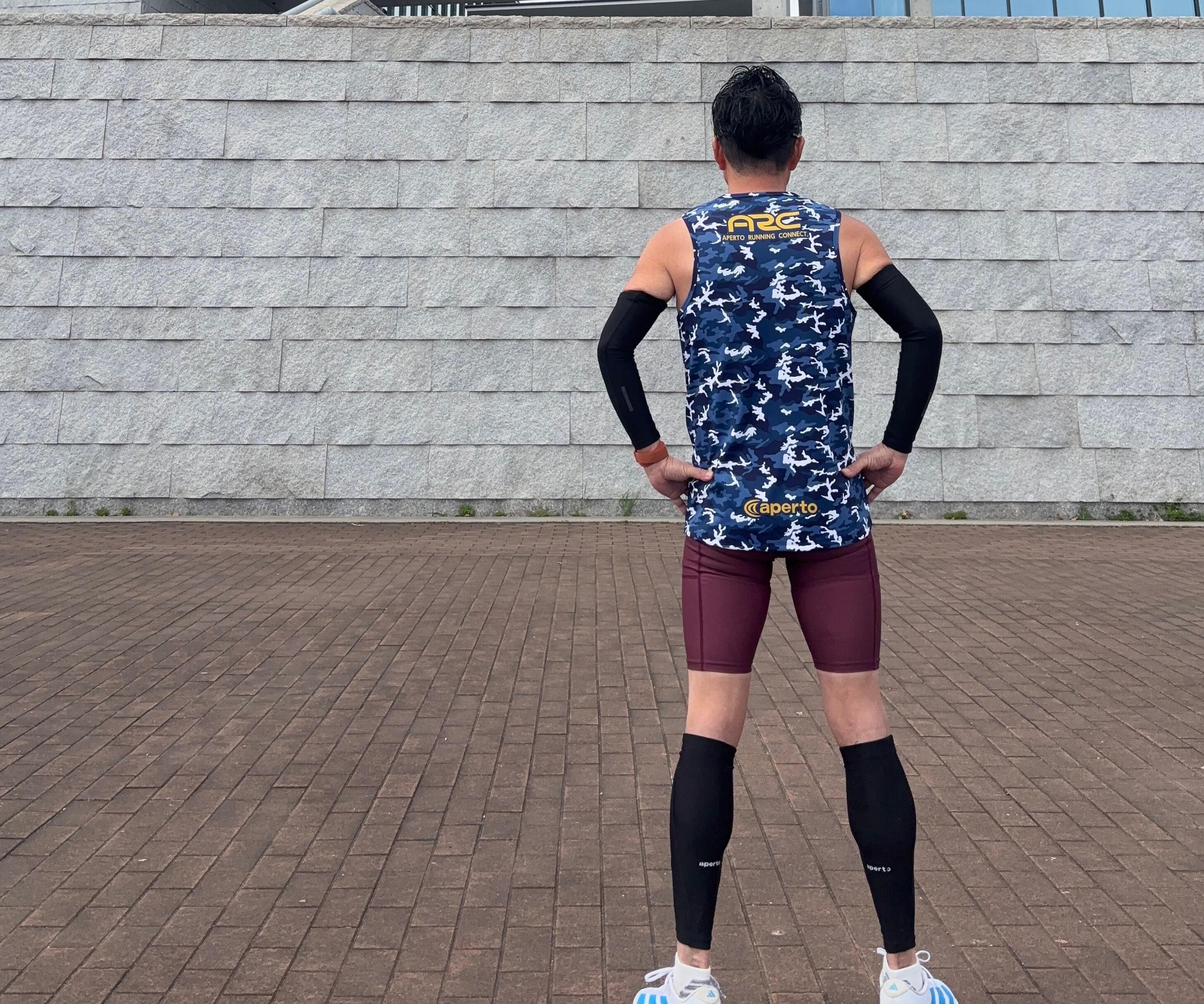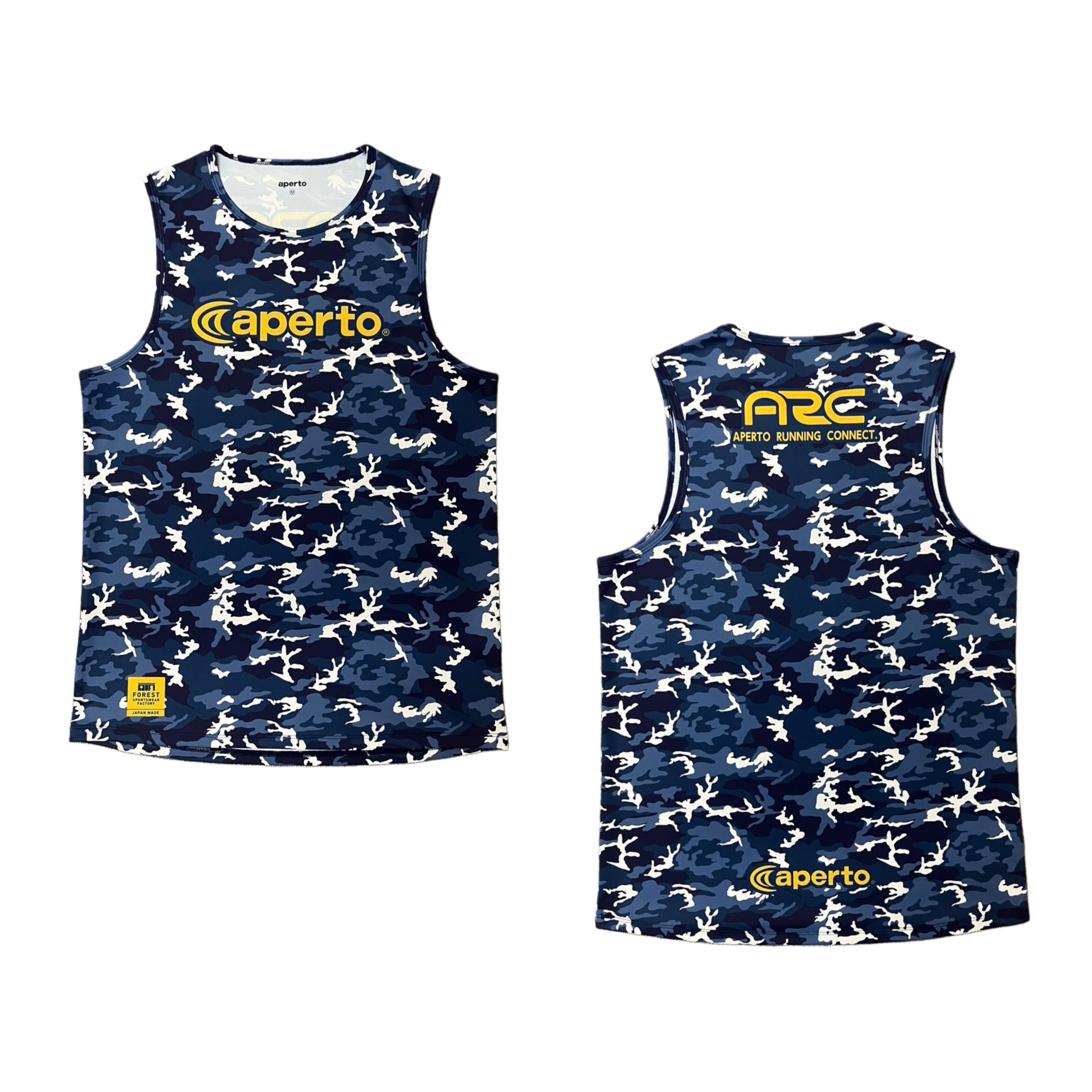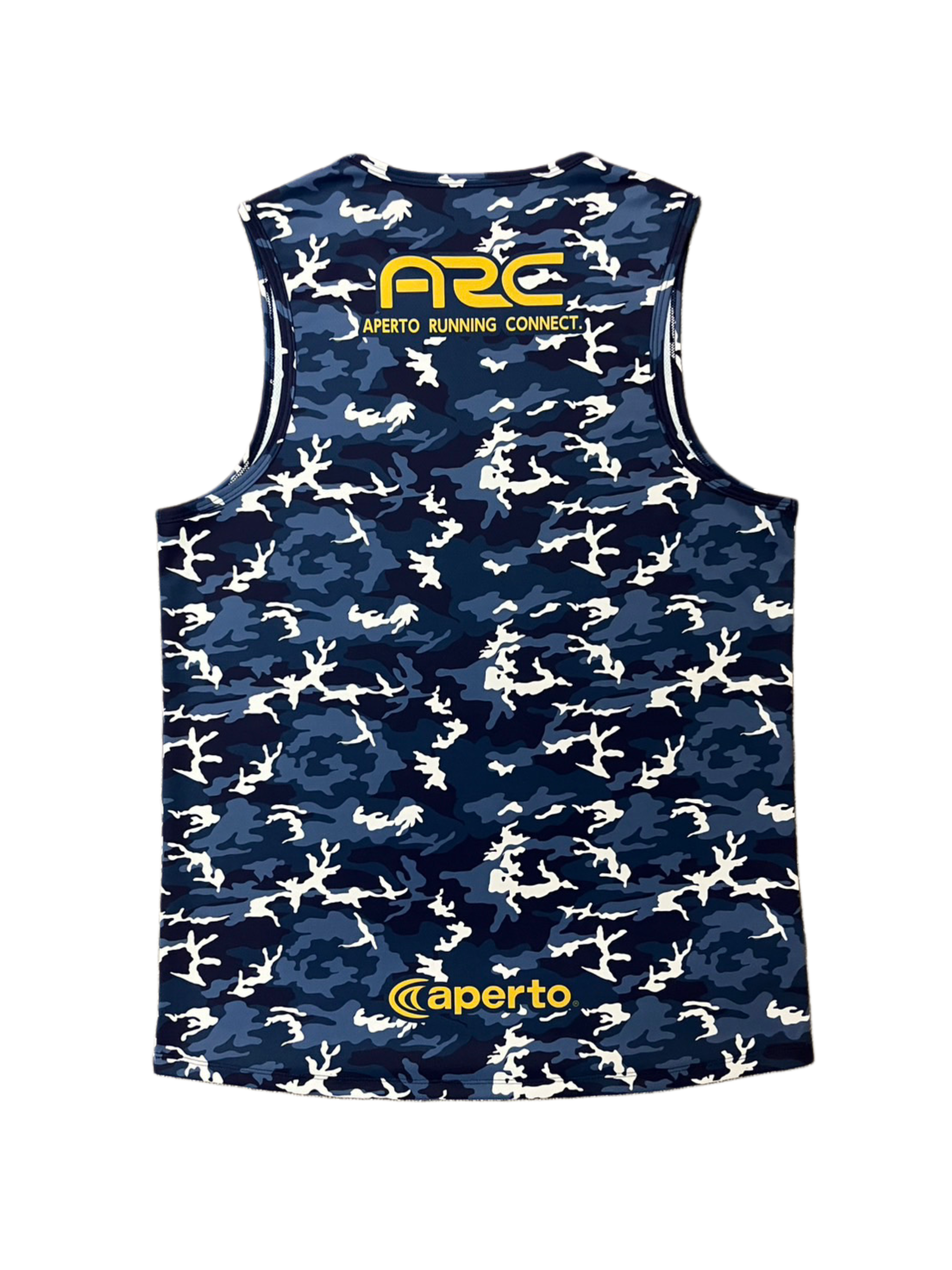 繊細なネイビーカモ柄を、自社全昇華で開発したノースリーブになります。ロードからトレイルまで幅広く活躍するアイテムです。前面にアペルトロゴと背面にARCロゴをアレンジしています。全昇華プリントによって開発された柄は太陽光に映え、タイツとのスタイリングによりお洒落なランニングスタイルを演出します。これからの季節にピッタリなお勧めアイテムです。