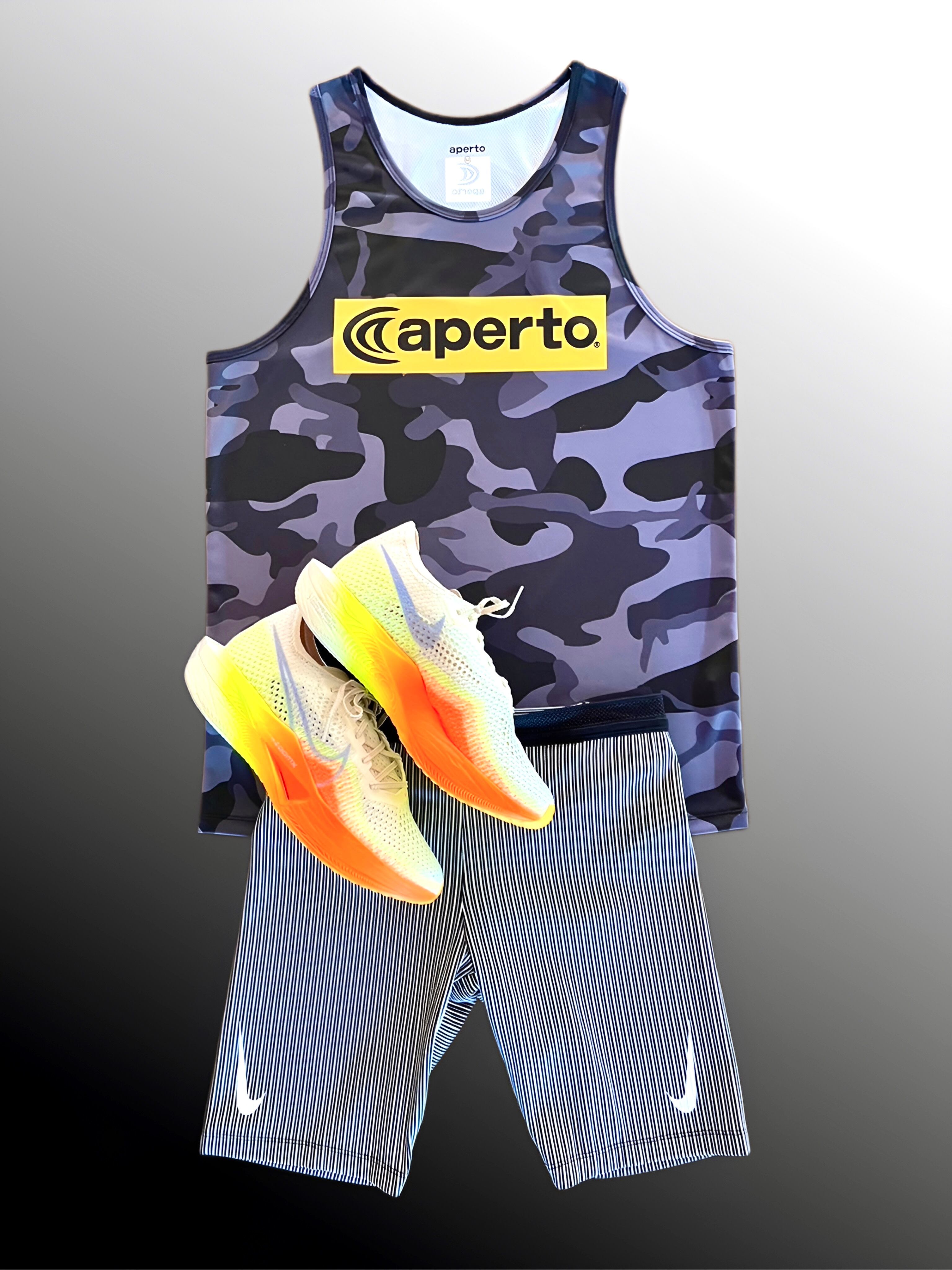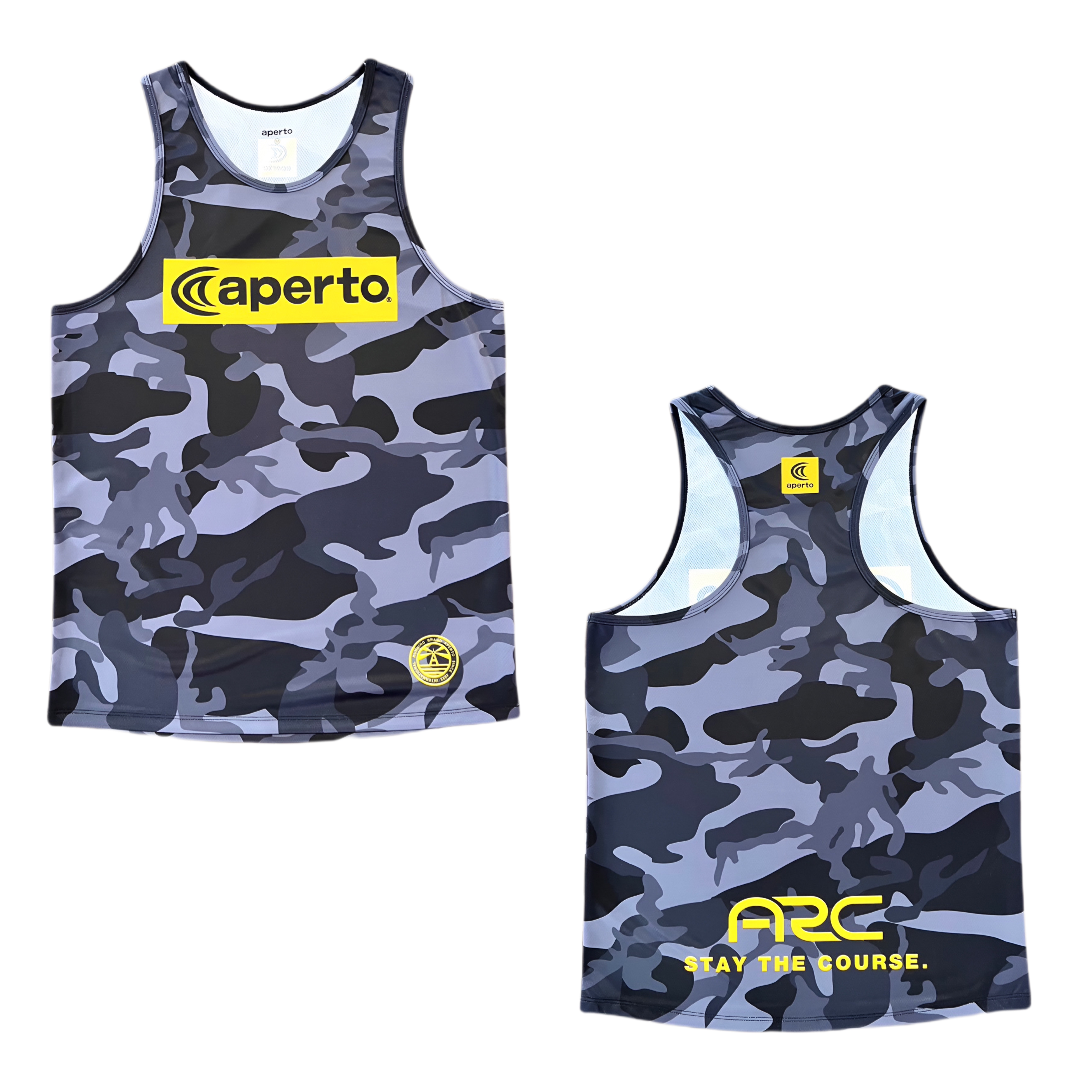 アペルトオリジナルでパターンしたシングレットです。ランナーらしいスタイリッシュな設計にしております。裾は若干後ろを長く、前後差をつけており、緩やかなカーブにしております。着丈も少し長めにしており、パンツとの相性もよいスタイリッシュなデザインです。自社の昇華パネルプリントで開発した4色使いのカモ柄です。ランナー様の定番人気を誇るブラックのカモ柄は、周りの目を惹く格好よさの魅力がたっぷりです。レースでの差別化された本格派シングレットとして是非ご愛用ください。
