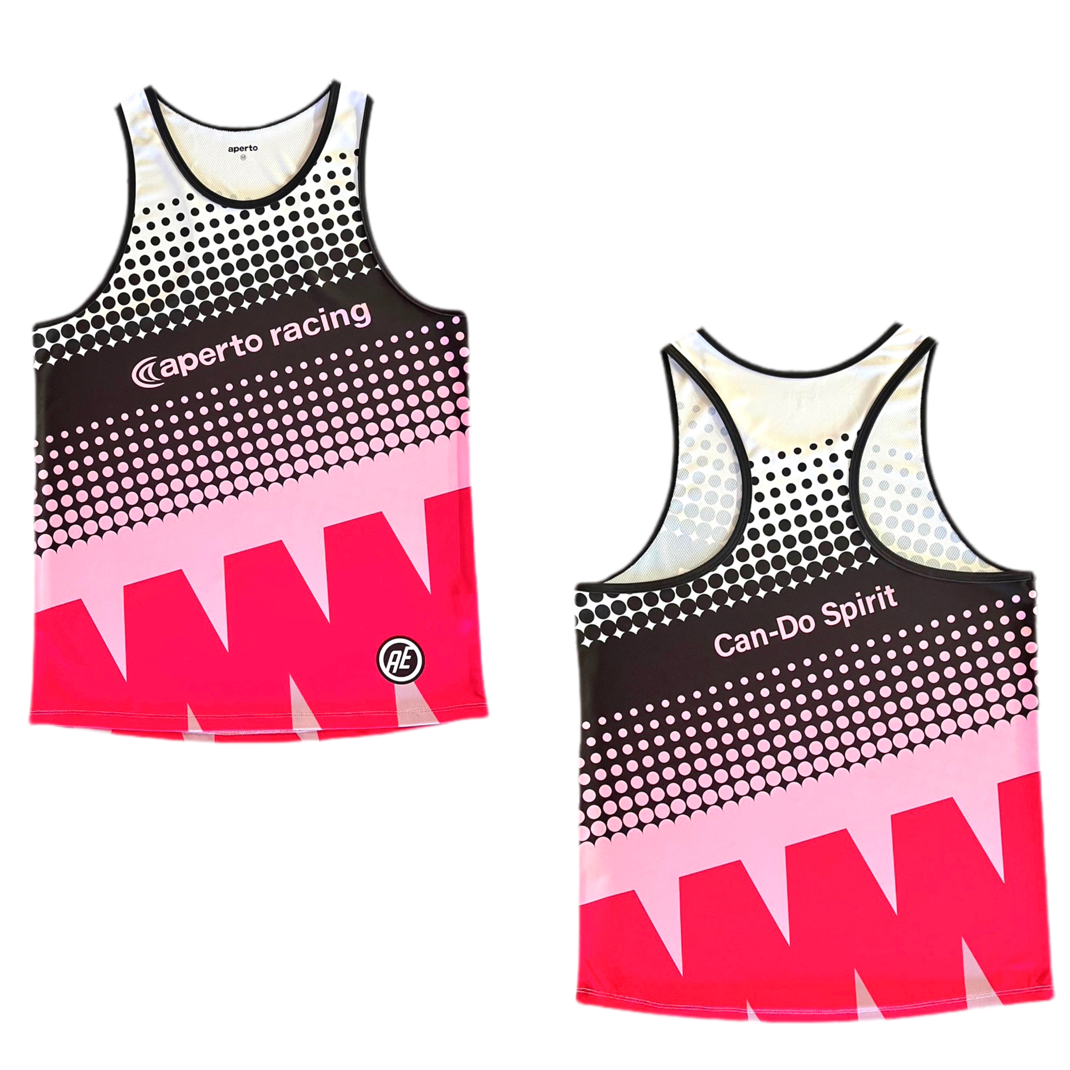 アペルトオリジナルでパターンしたシングレットです。ランナーらしいスタイリッシュな設計にしております。裾は若干後ろを長く、前後差をつけており、緩やかなカーブにしております。着丈も少し長めにしており、パンツとの相性もよいスタイリッシュなデザインです。アペルトからランニングのエキスパートへお届けするAEライン企画のシングレットです。自社で研究したパターンを手作業で丁寧に裁断して縫製しています。自社でデザイン企画して昇華パネルプリントで開発したシングレットはレースでの走りをカッコよく華やかに演出します。ピンクとレッドのコントラストが映えるお勧めのシングレットです。