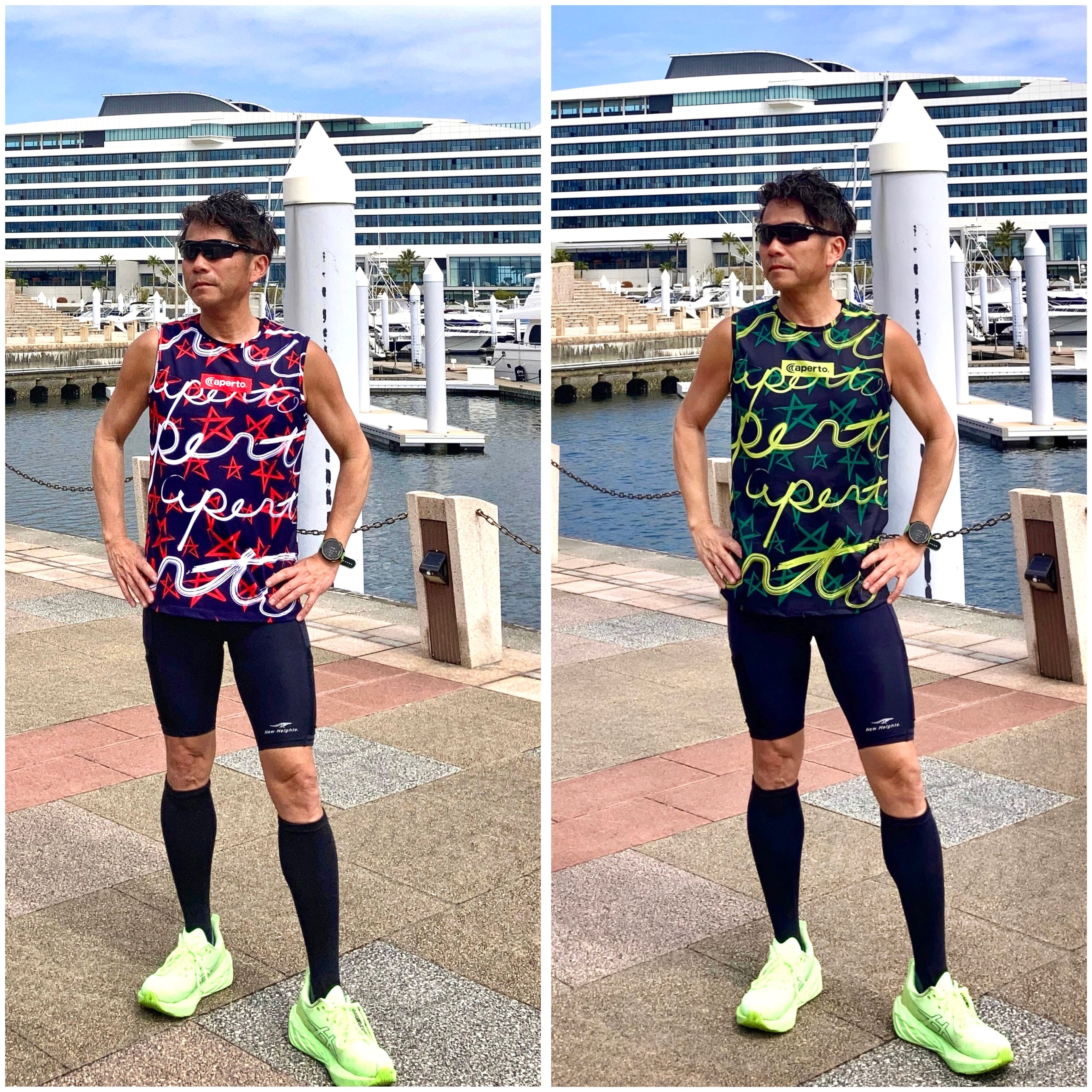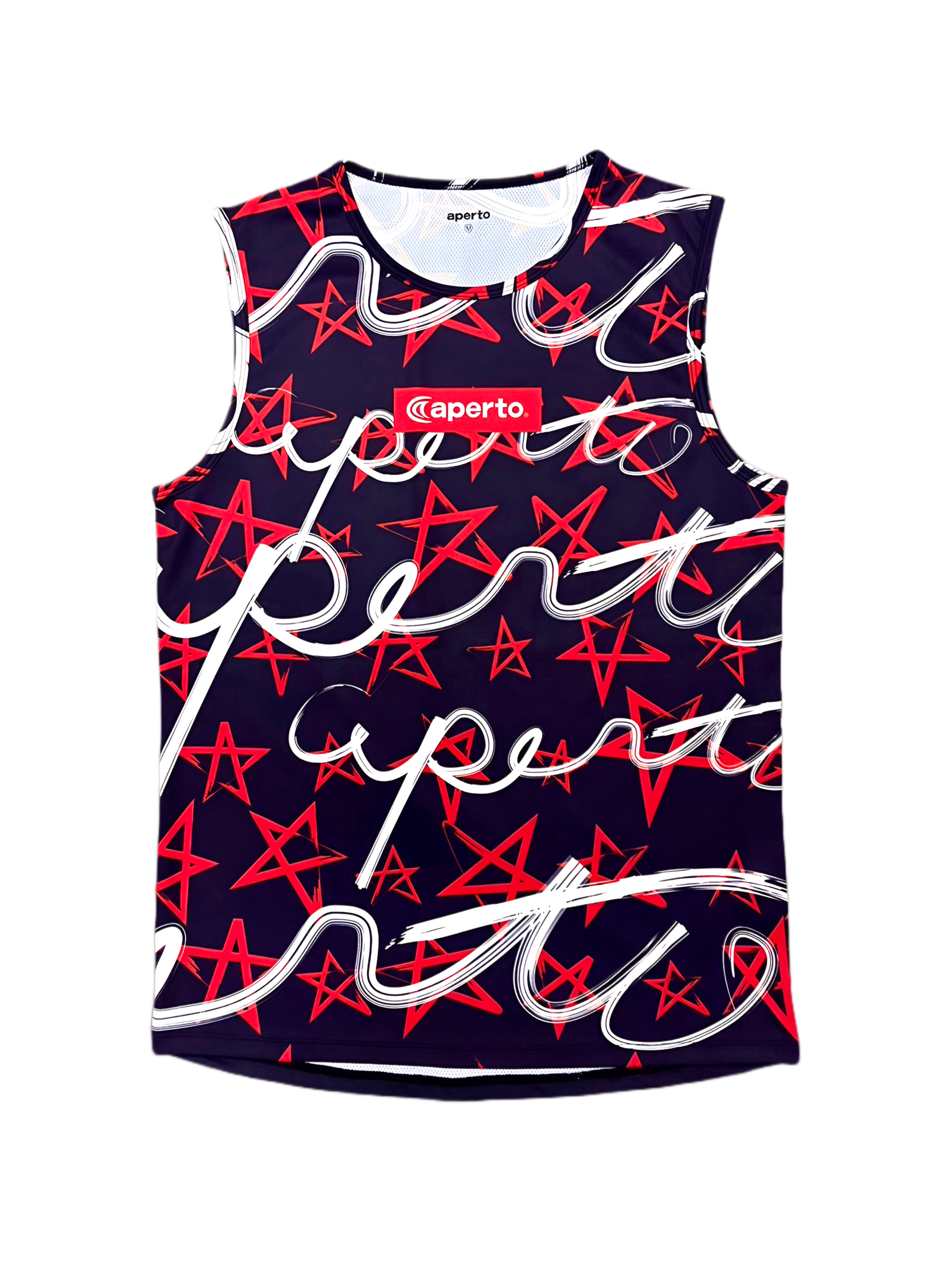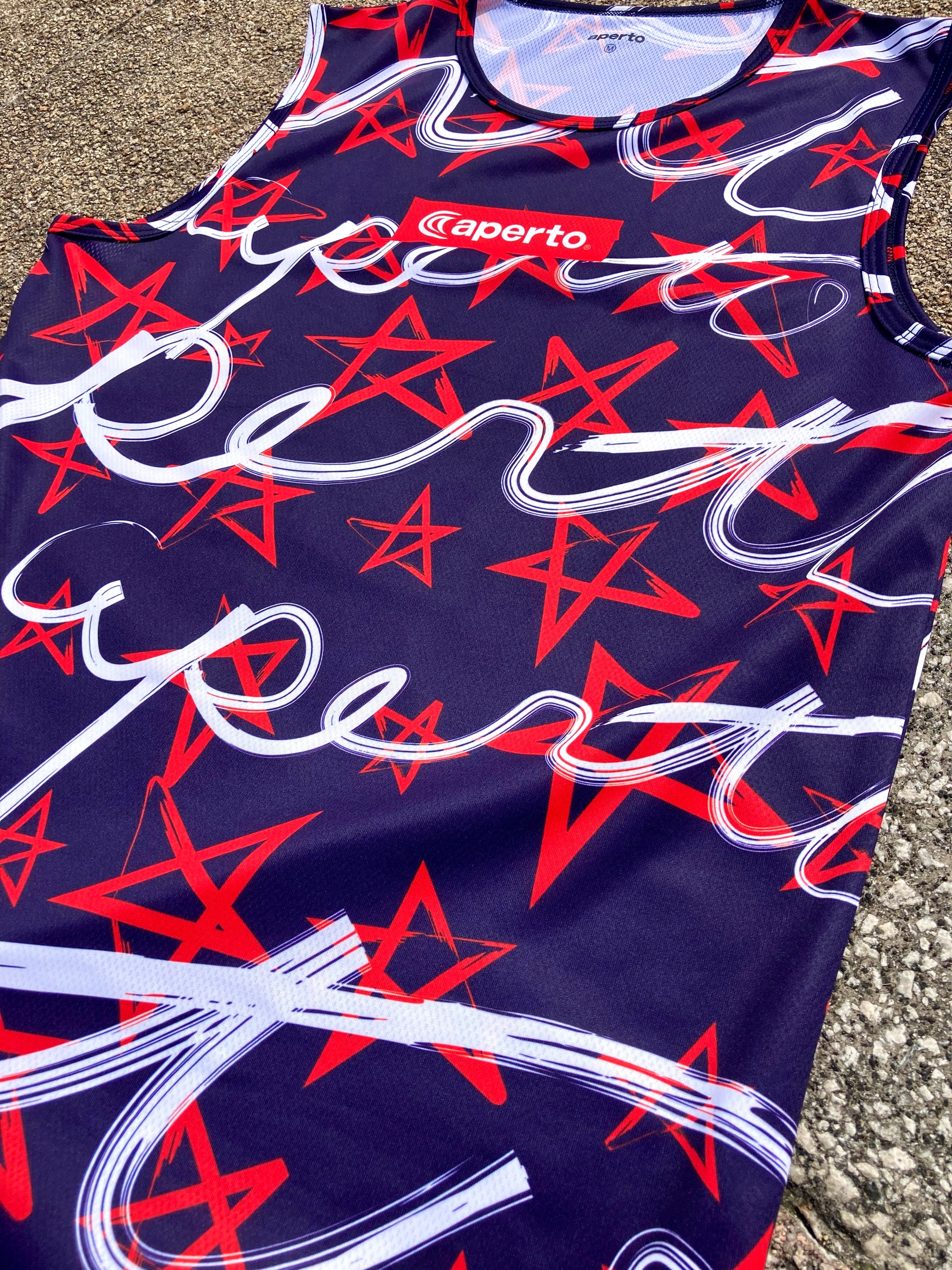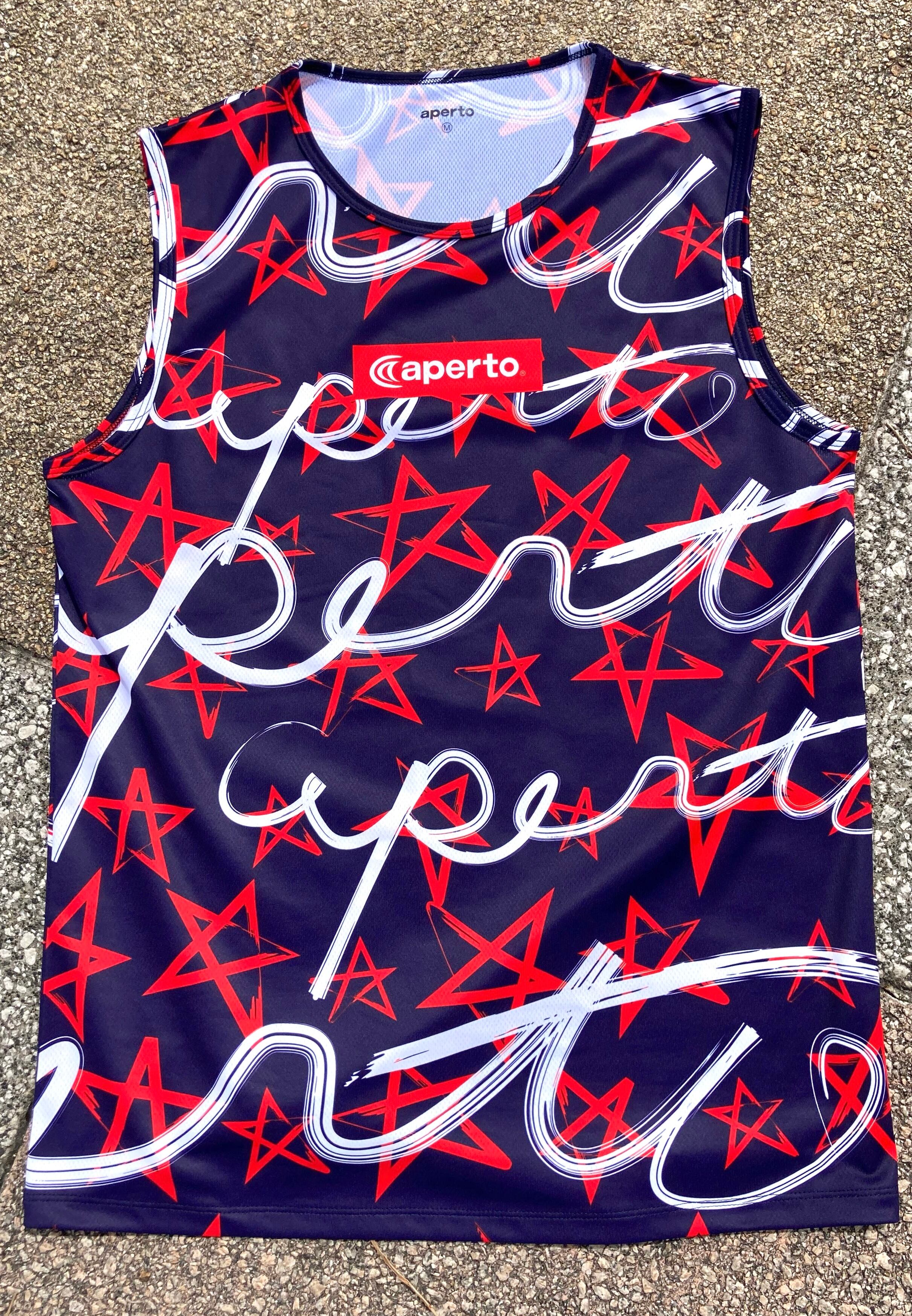 スタイリッシュなパターンのノースリーブです。襟開きも大きすぎないため、すっきりと見えて、屈んでも胸元を気にしないで安心してご着用頂けます。裾は若干後ろを長く、前後差をつけており、緩やかなカーブにしておりパンツとの相性もよいスタイリッシュなデザインです。人気のランダムスター柄にアペルトのサインをアレンジしたお洒落なデザインです。1枚毎に作成するパネル昇華プリントだから表現できる差別化されたデザインです。レースではもちろん、街ランやリゾート地でのランニングにもピッタリなお洒落で格好よいノースリーブです。男女問わずお勧めのデザインです。