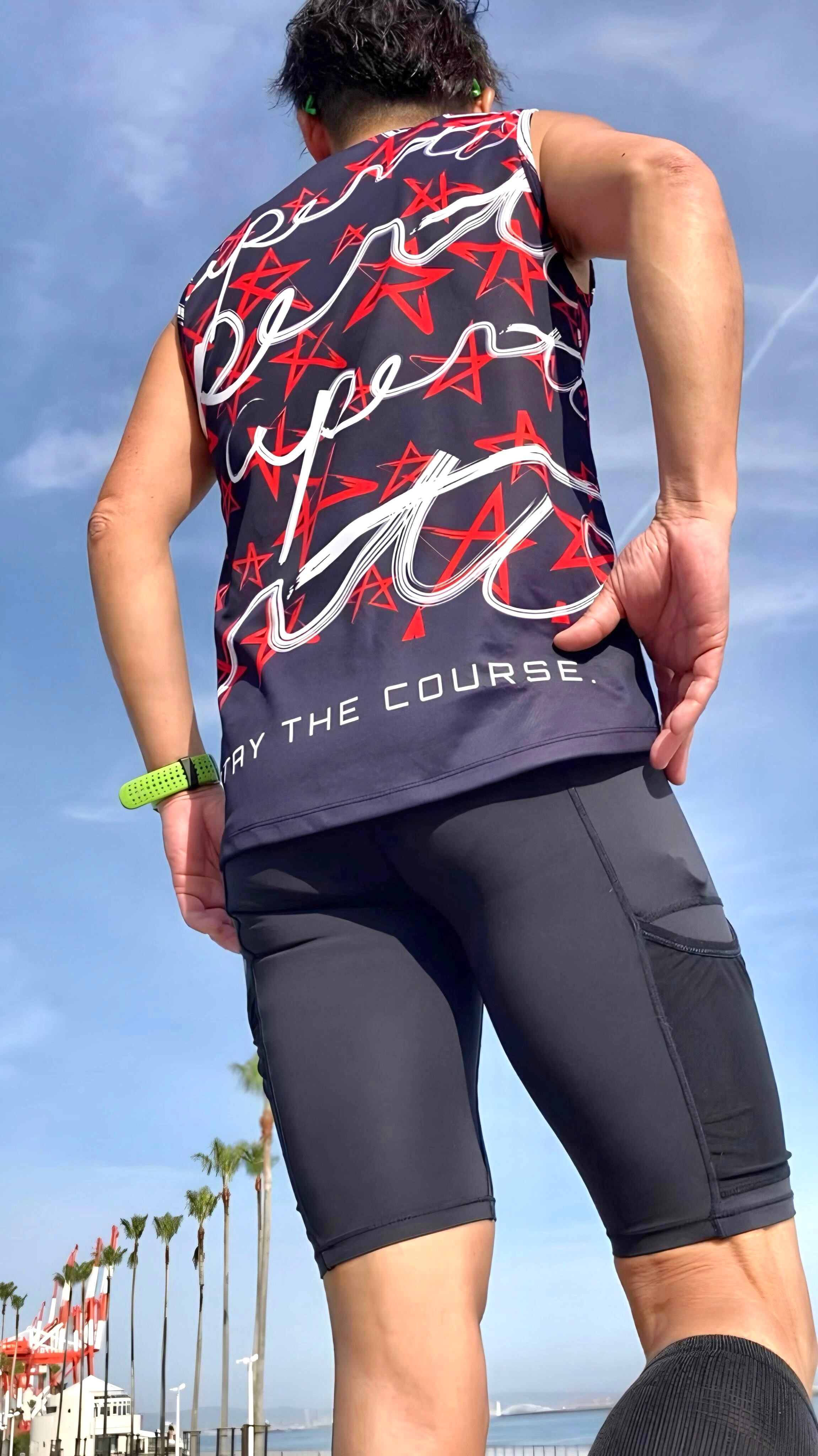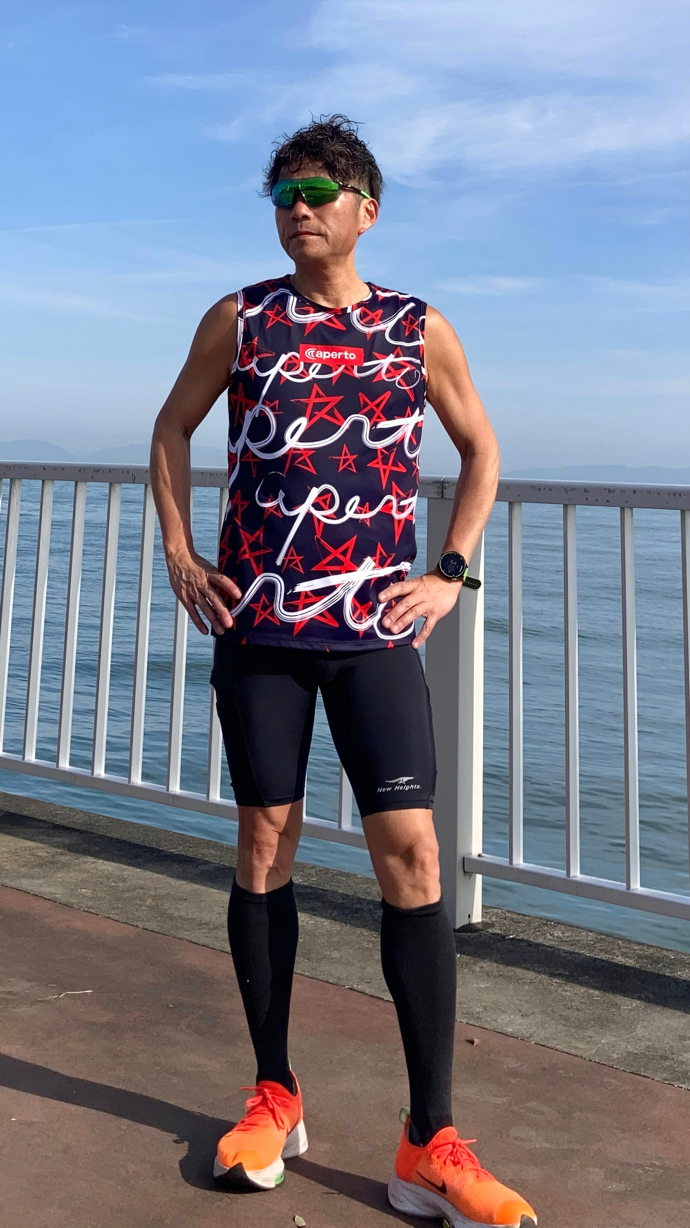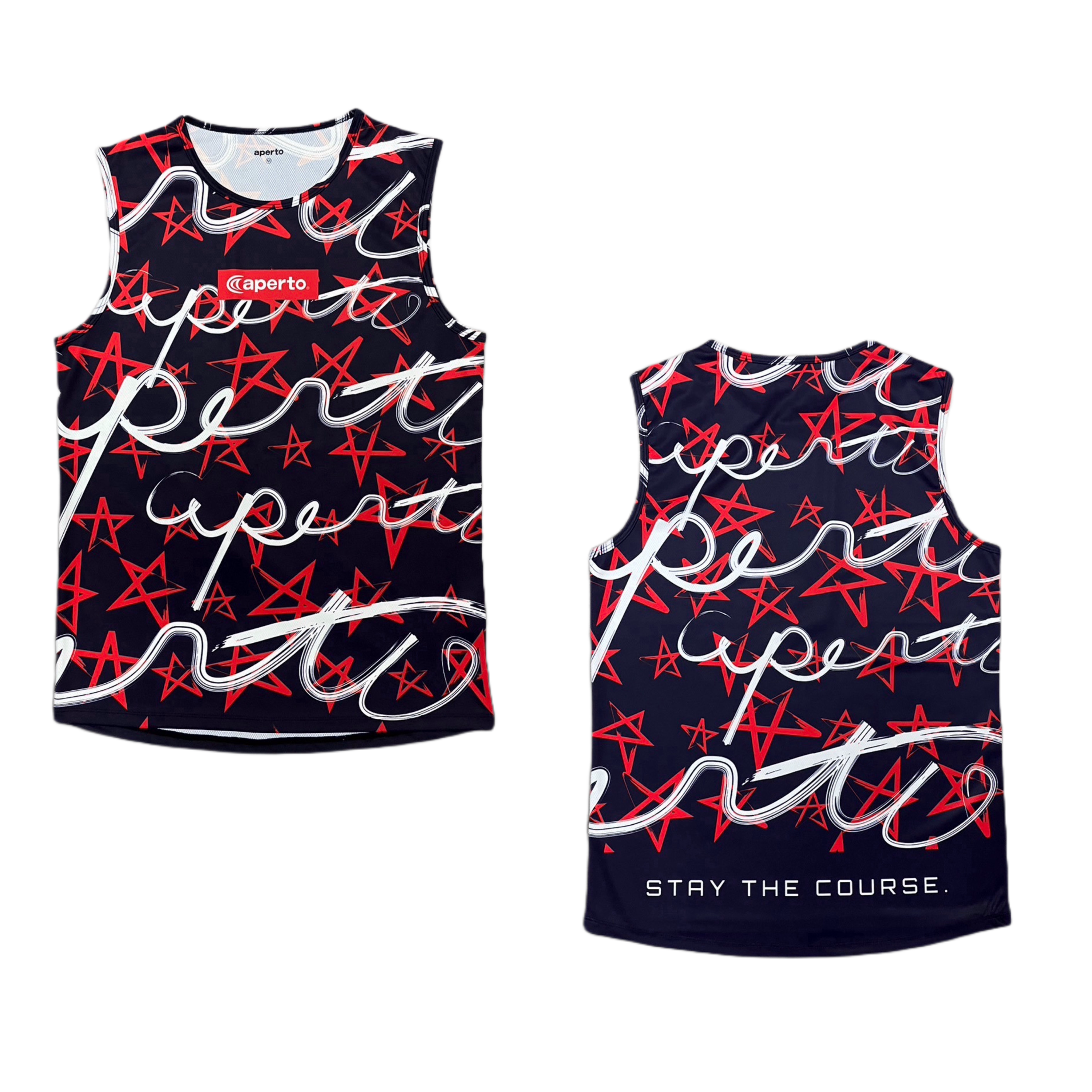 スタイリッシュなパターンのノースリーブです。襟開きも大きすぎないため、すっきりと見えて、屈んでも胸元を気にしないで安心してご着用頂けます。裾は若干後ろを長く、前後差をつけており、緩やかなカーブにしておりパンツとの相性もよいスタイリッシュなデザインです。人気のランダムスター柄にアペルトのサインをアレンジしたお洒落なデザインです。1枚毎に作成するパネル昇華プリントだから表現できる差別化されたデザインです。レースではもちろん、街ランやリゾート地でのランニングにもピッタリなお洒落で格好よいノースリーブです。男女問わずお勧めのデザインです。