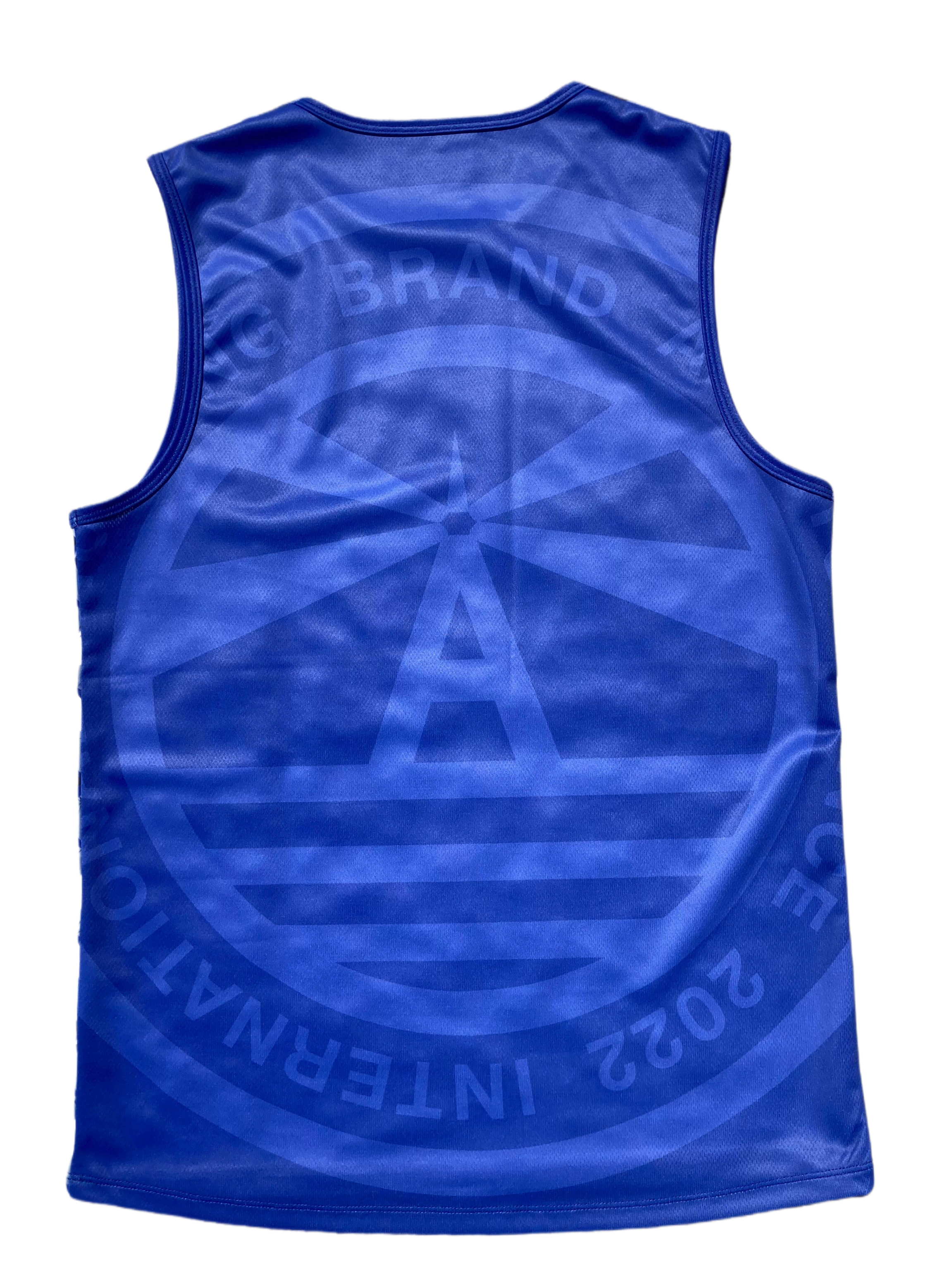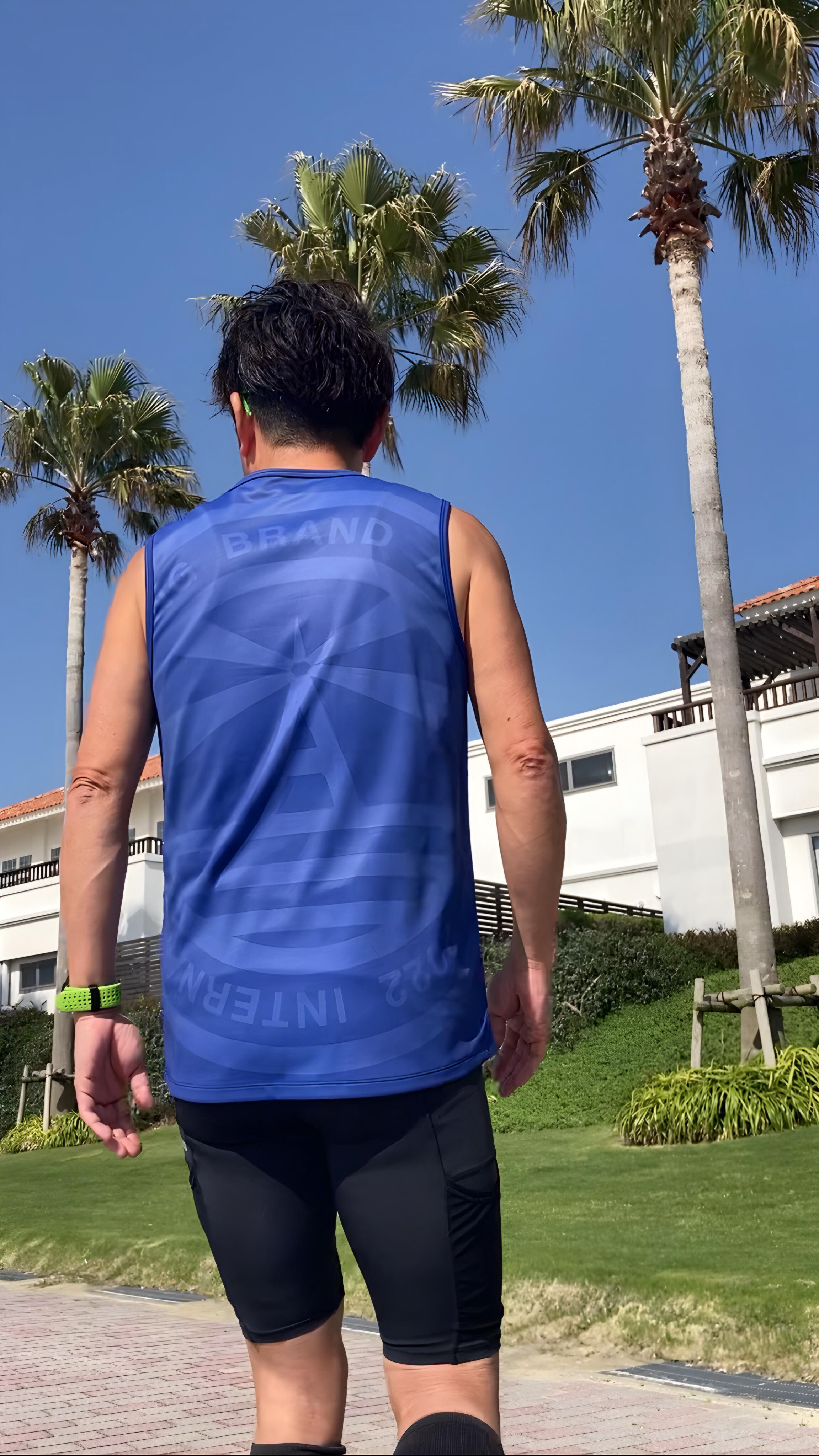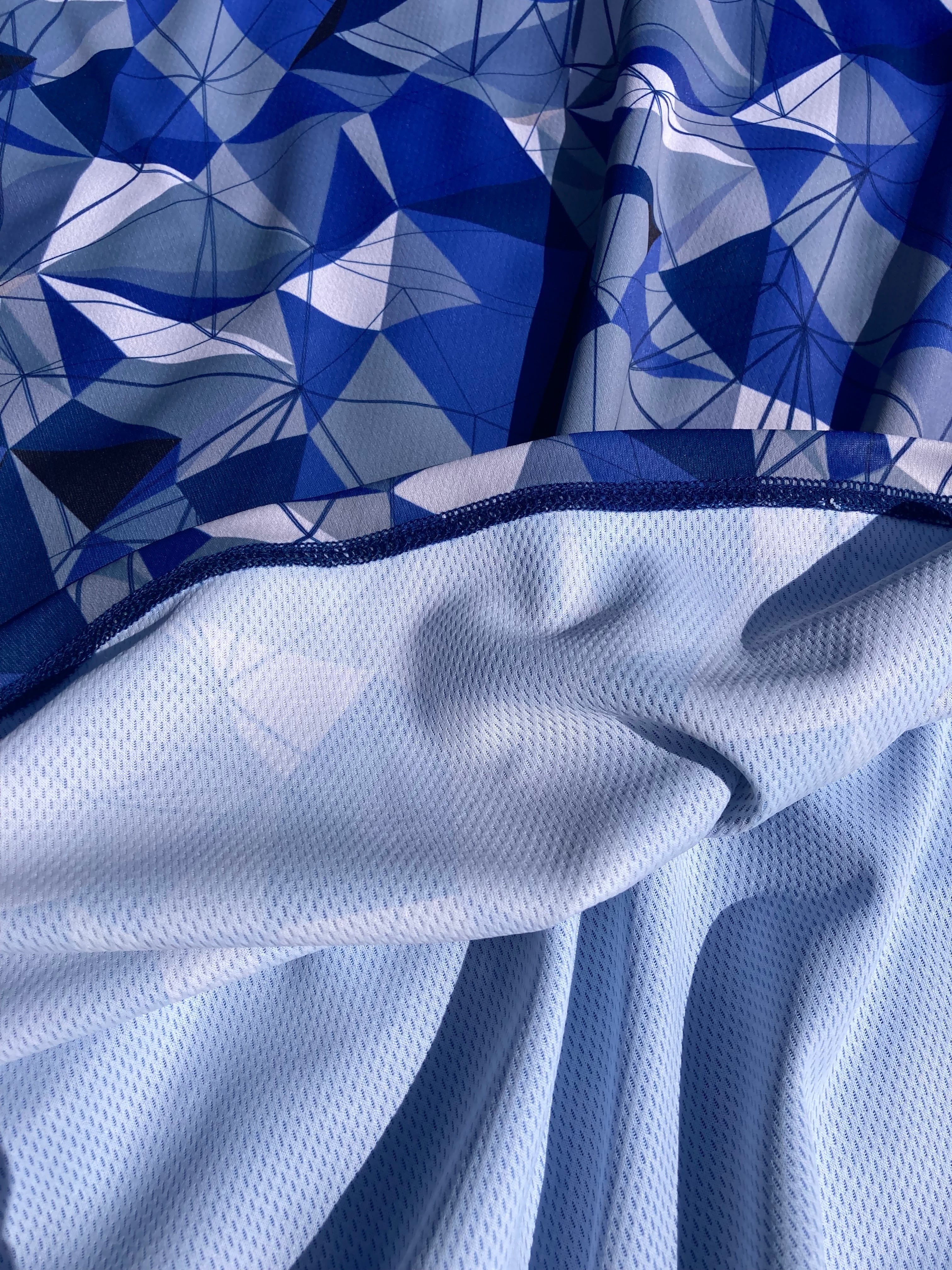 吸水速乾性が高くUV加工の日本製ポリエステル機能素材を使用しています。表面はサラッとした肌触りのよい滑らかな組織で、内側がメッシュ組織の、表裏で違う組織になっています。そのため、汗をかいてもベタツキにくく、通気性と速乾性に優れた機能素材です。柔らかい風合いで伸縮性も高く、ランニングに適した動きやすい素材です。表面がきれいなため昇華プリントがハッキリと綺麗に映えます。