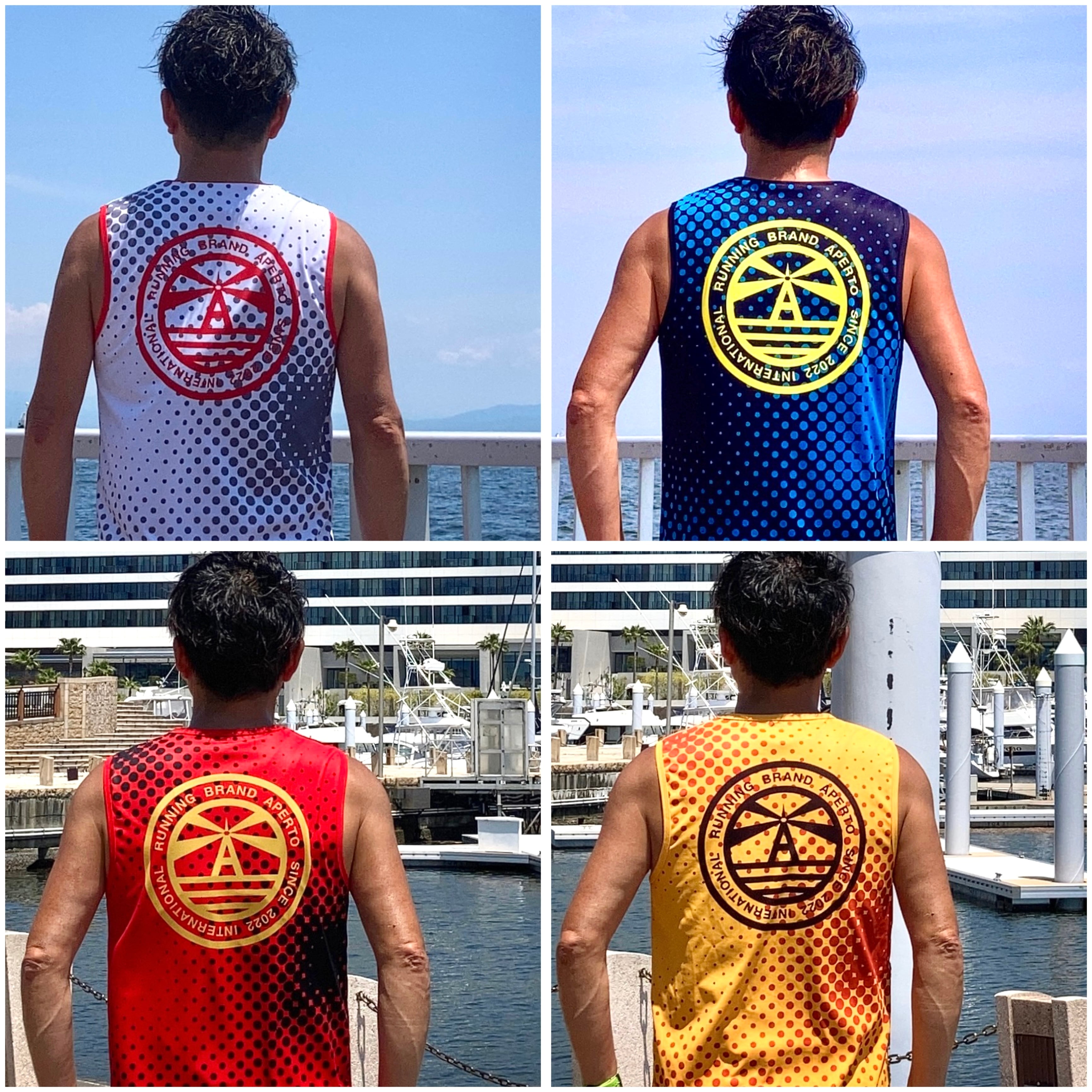 デジタル図案でランダムにアレンジされたドットがお洒落なデザインになっています。バックには存在感のある灯台ロゴがアレンジされています。カラー調整をして一枚一枚デザインをそのまま昇華パネル染めプリントして生産するアペルトの魅力あふれるデザインになっております。これからの季節にお勧めのノースリーブです。