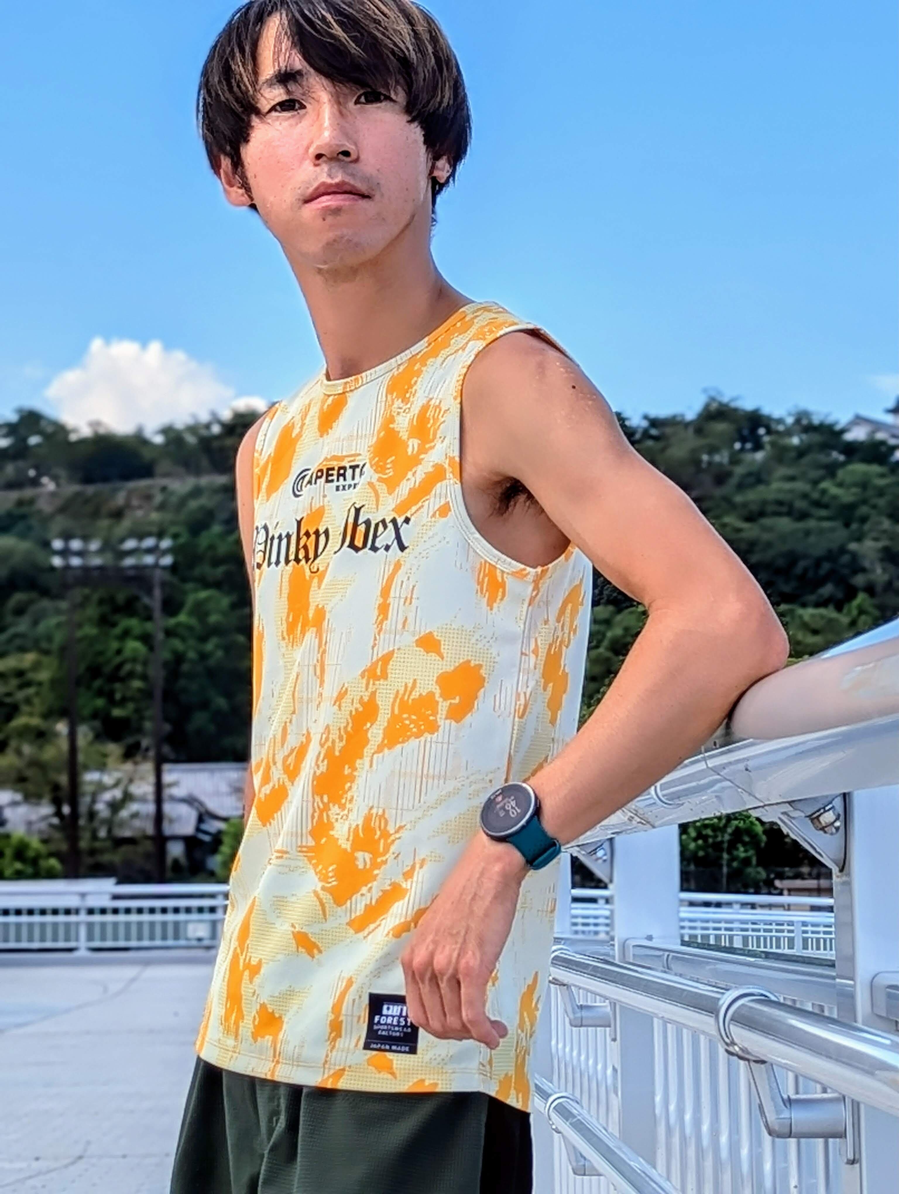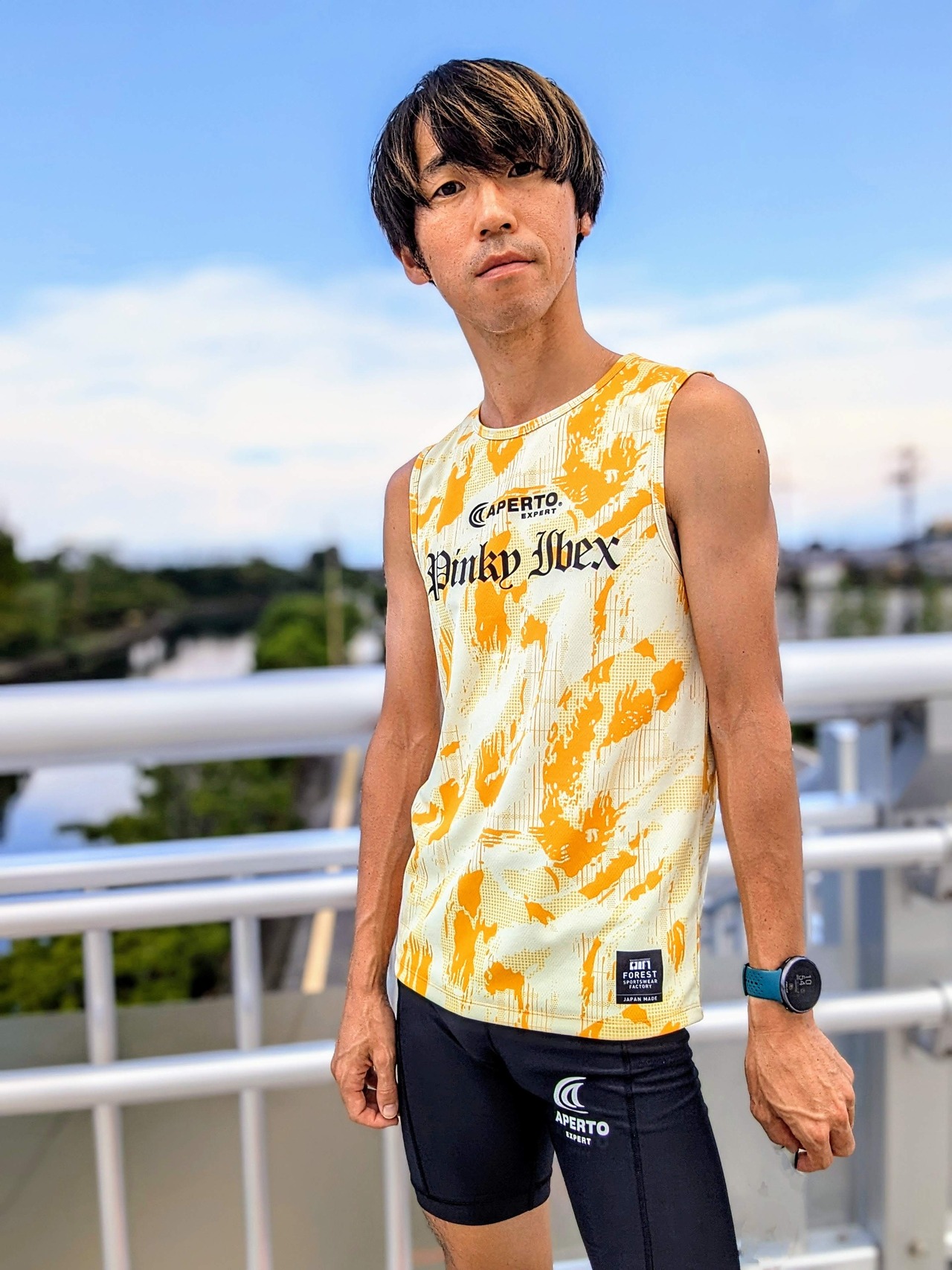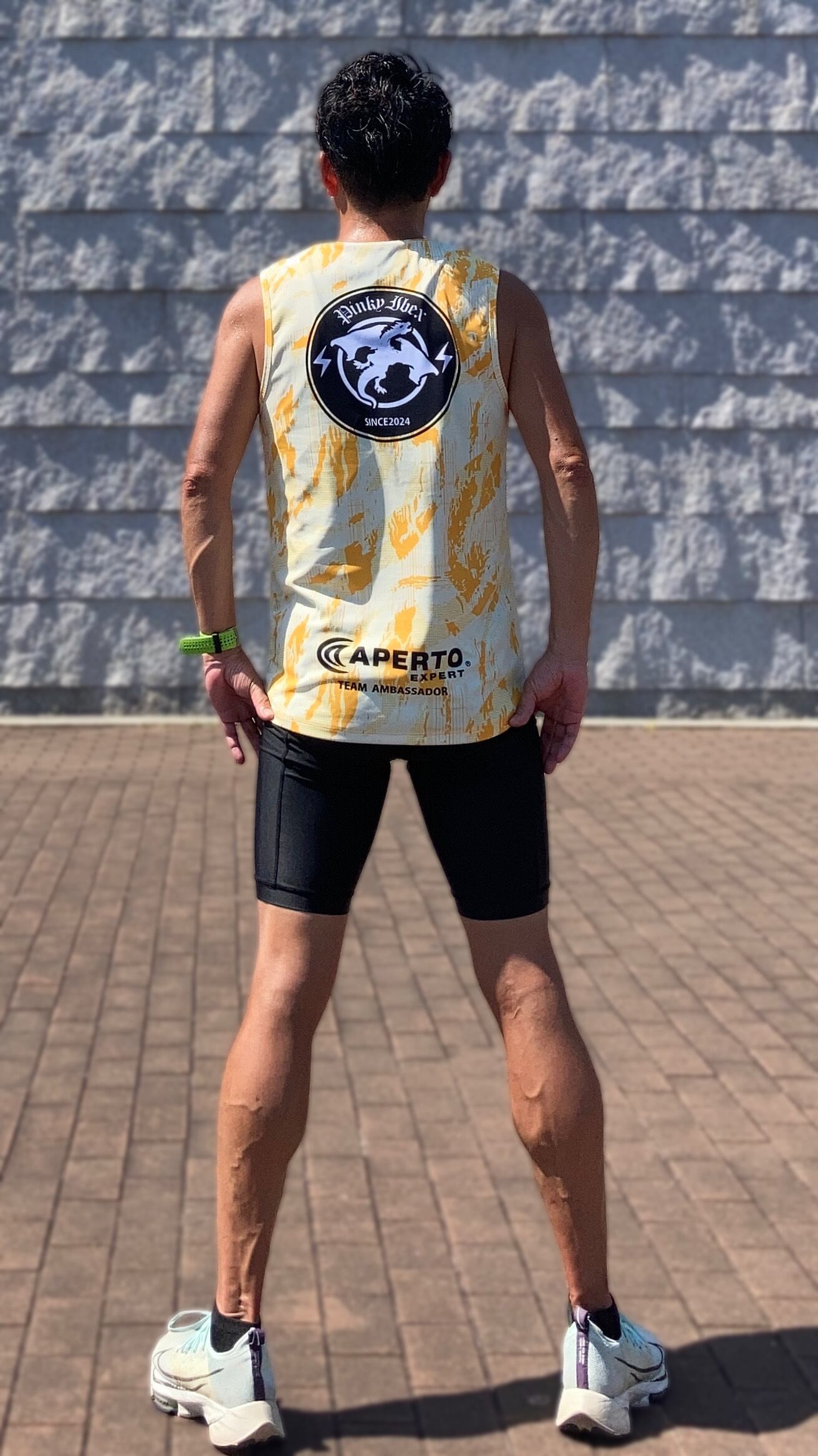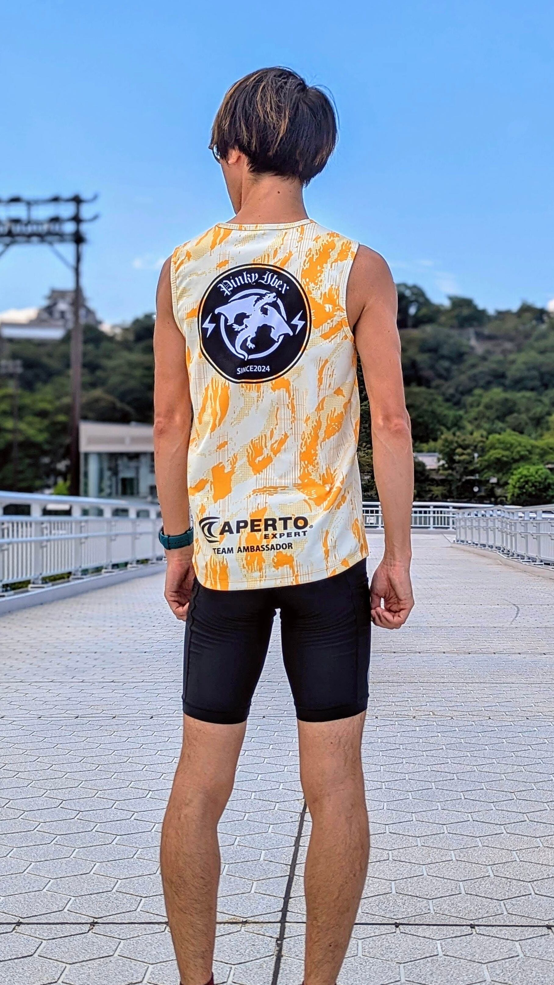 ランニングコミュニティ企画のピンキーアイベックスロゴを格好よくアレンジしたデザインになっています。白地にイエローのプリントが綺麗に映え、ランニングスタイルを格好よく演出するノースリーブです。皆様にこちらのピンキーアイベックスレーシングノースリーブで、秋冬レースを頑張って頂きたいという思いを込めた応援プライス企画です。是非レースでもご着用くださいませ。