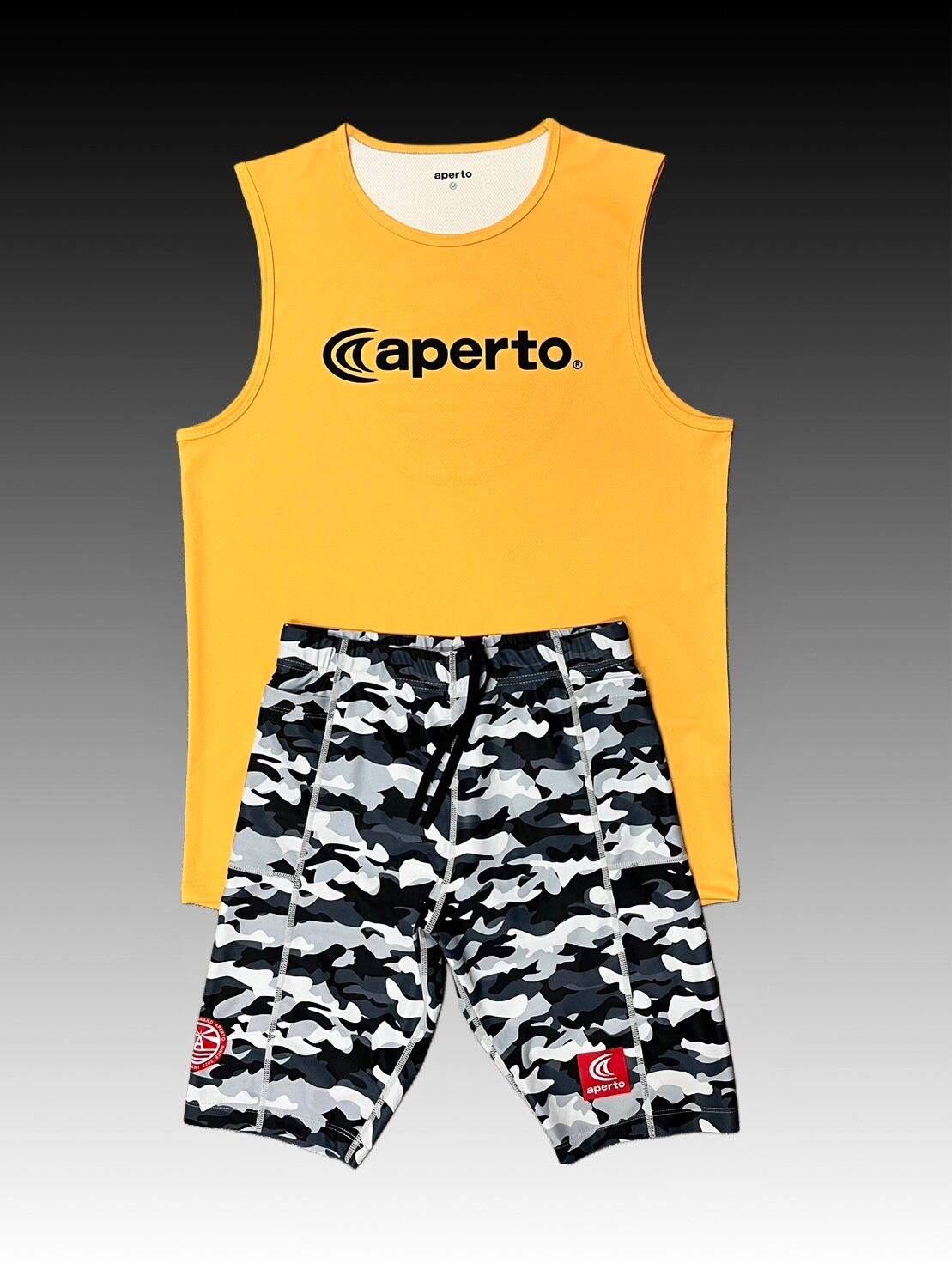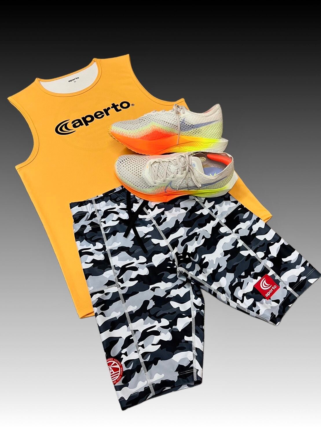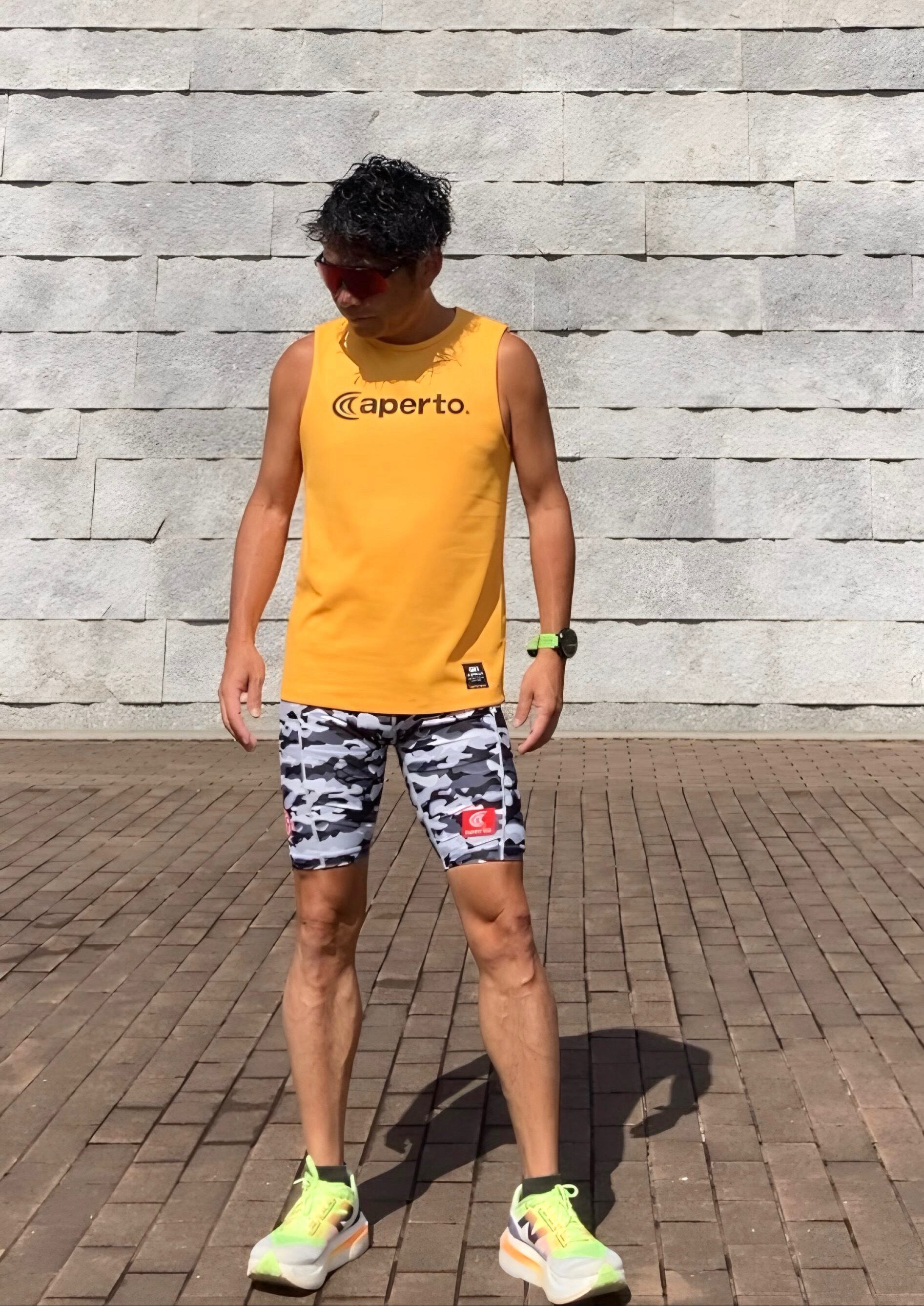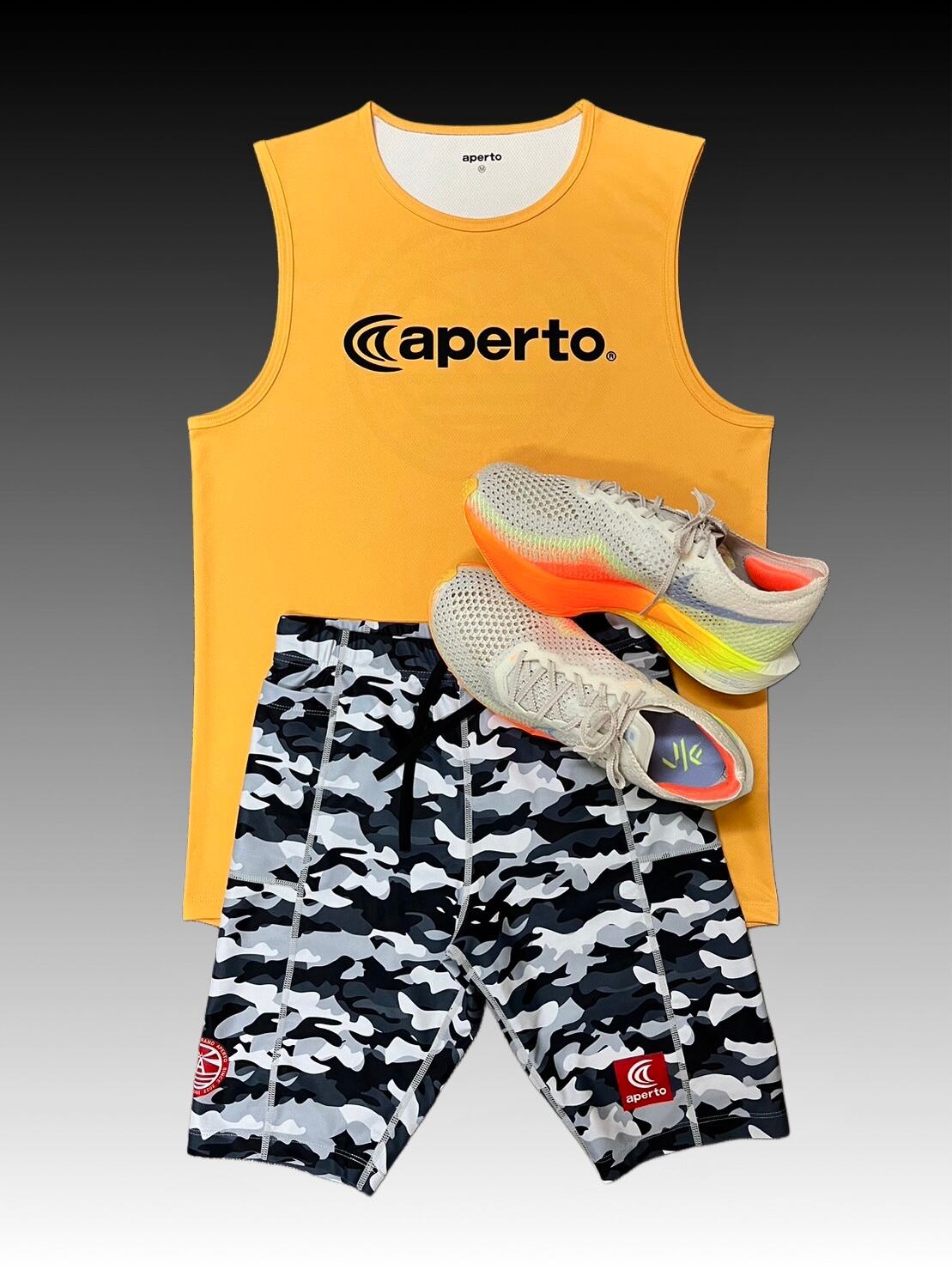 柄のアドバンスタイツとの相性もよいオレンジイエローです。染められた流通生地を使用するのでなくアペルトが自社開発した昇華なので独特の綺麗な発色になっています。バックに灯台マークをシンボルとしたロゴをデザインしたシンプルで格好いいノースリーブです。